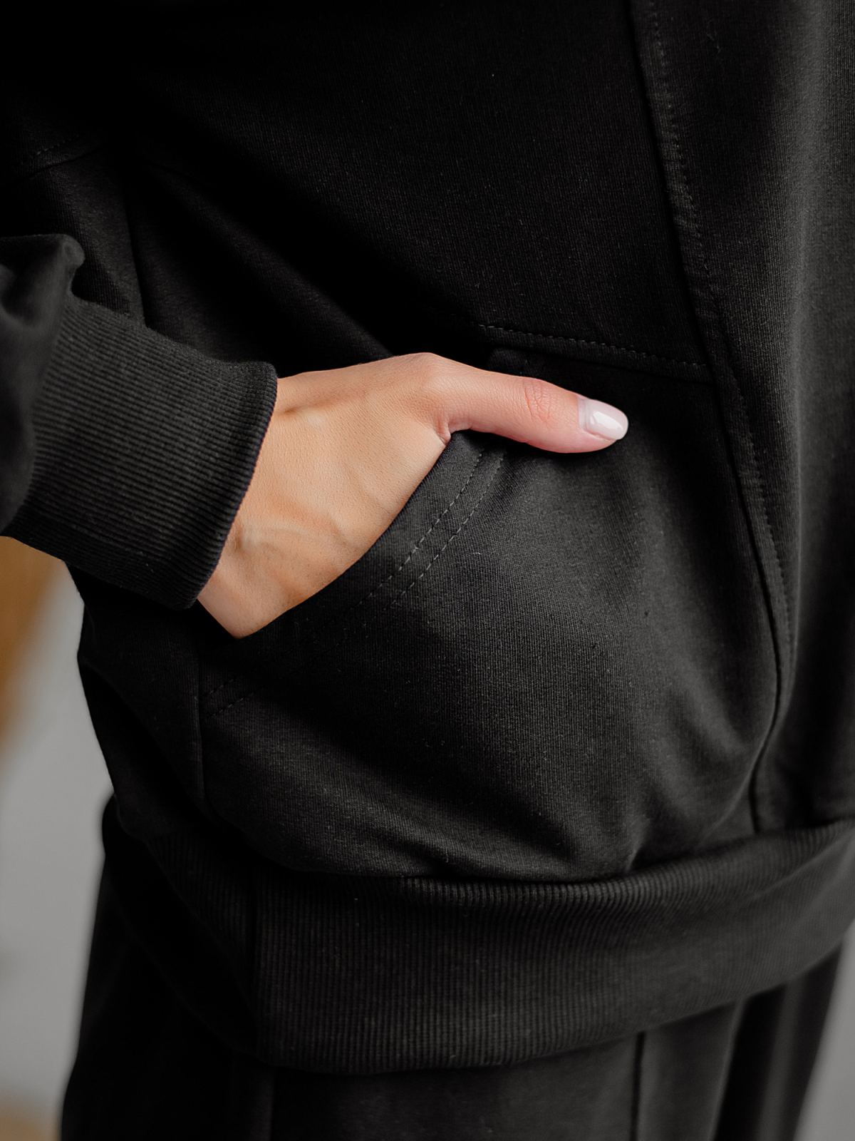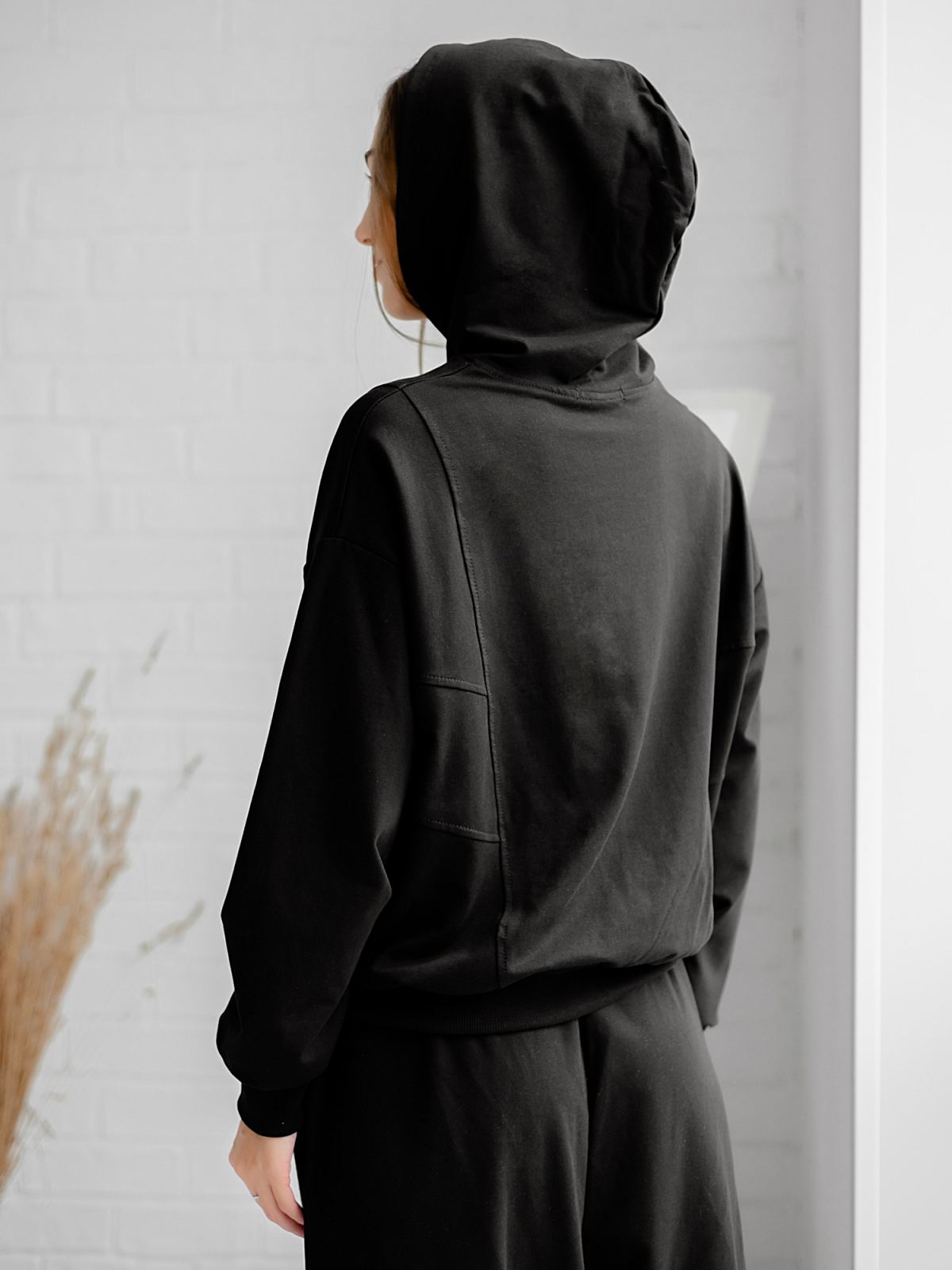 Толстовка свободного силуэта с капюшоном и карманами из футера черного цвета . Капюшон на подкладе, рукава и низ изделия - на манжетах. Отделка по спине и спереди в виде составных рельефов придает модели стильность и оригинальность. Изделие выполнено из трикотажа премиального качества - ПЕНЬЕ, с содержанием хлопка более 92%