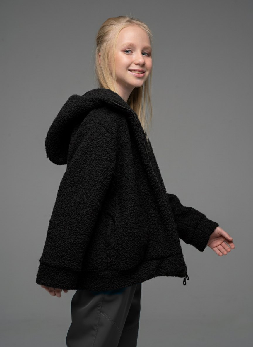 Плюшевая толстовка из шерпа черного цвета для девочкис длинными рукавами и капюшоном от российского производителя "Looklie" - стильная уютная вещь гардероба для каждой девочки. Кофта тедди с боковыми карманами выполнена из шерпы премиального качества. Детская толстовка свободного силуэта очень мягкая, теплая и приятная к телу. Трендовая кофта для девочки имеет объмные рукава и двойной капюшон . Толстовка тедди для девочки — тренд 2025. Застежка молния позволяет легко надевать и снимать кофту, а также регулировать температуру внутри. Карманы добавляют удобство и функциональность в эту толстовку. Кофта детская плюшевая идеально подходит для прогулок, отдыха и повседневной носки. Качество ткани, а также бережный уход (рекомендована бережная стирка при температуре до 30 градусов) обеспечивает длительный срок службы кофты, материал не растягивается и не выцветает.