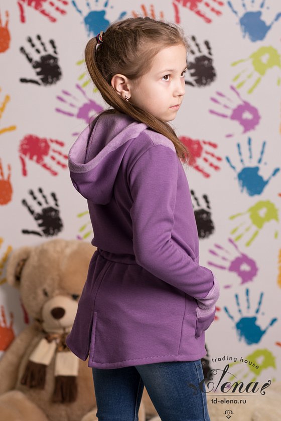 Толстовка с застёжкой на молнию выполнена из футер петли трёхнитки. По линии талии вставлена резинка, спереди два кармана. Рукав длинный, заканчивается отворотом. С левой стороны вышивка.