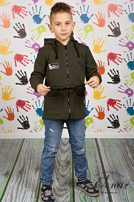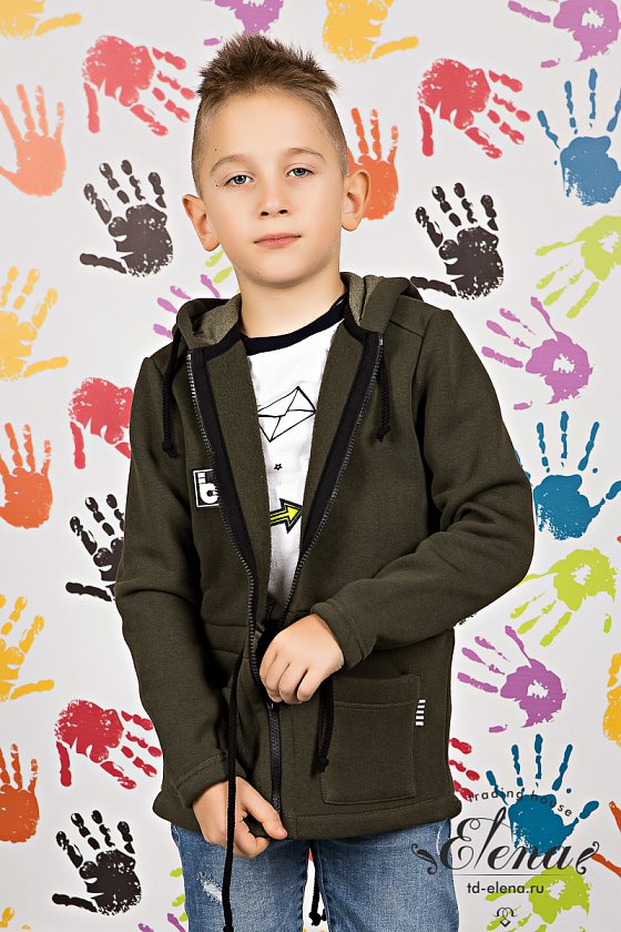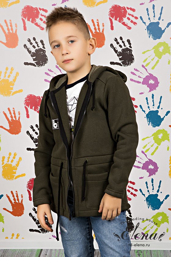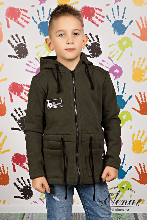 Толстовка с капюшоном, выполнена из полотна с начёсом. По линии талии проложена кулиска, которая регулирует прилегание к телу. Спереди настрочены карманы. Украшает толстовку лейба и маленький флажок из тесьмы в области кармана. Низ рукавов обработан эластичной резиной, которая скрывается в подгибке рукава.