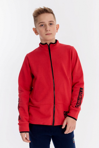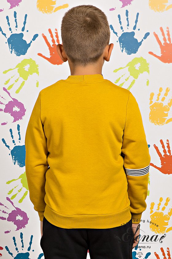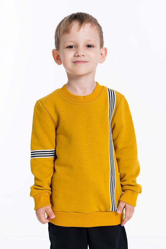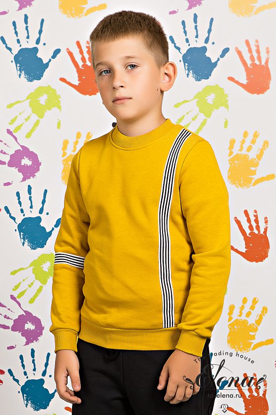 Толстовка выполнена из футер петли 3-х нитка. В качестве декоративных элементов спереди и на рукаве использована тесьма.