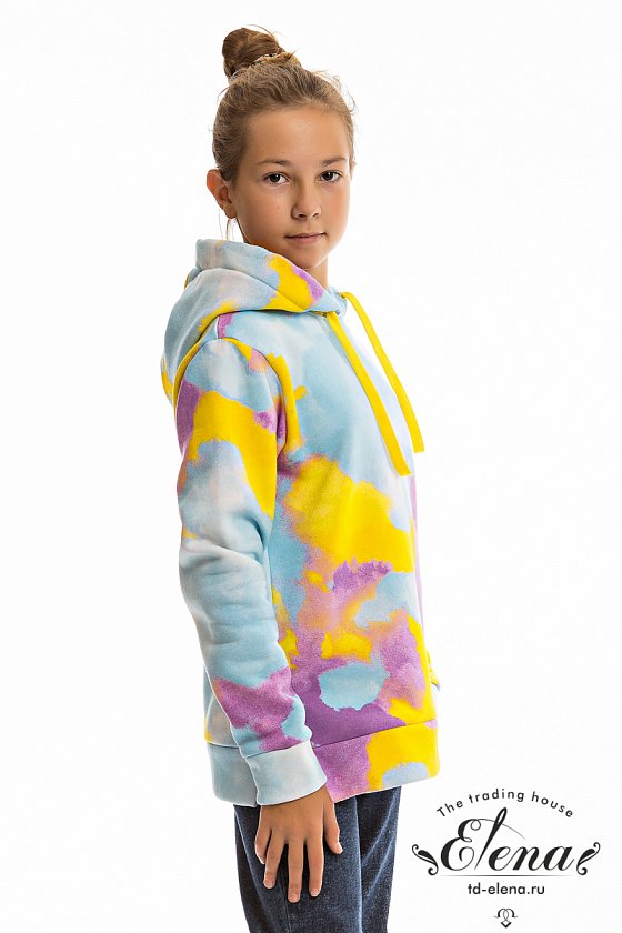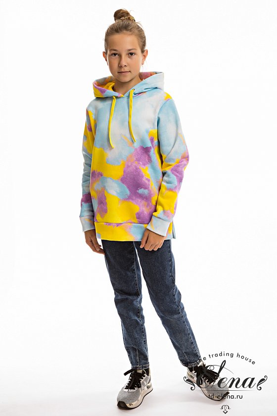Толстовка выполнена из трикотажного полотна с начёсом (футер трёхнитка). Длинный шнурок регулирует объём капюшона, рукава с притачными манжетами. В боковых швах сделаны декоративные разрезы. Толстовка идеально подойдёт под спортивный, повседневный стиль в одежде.