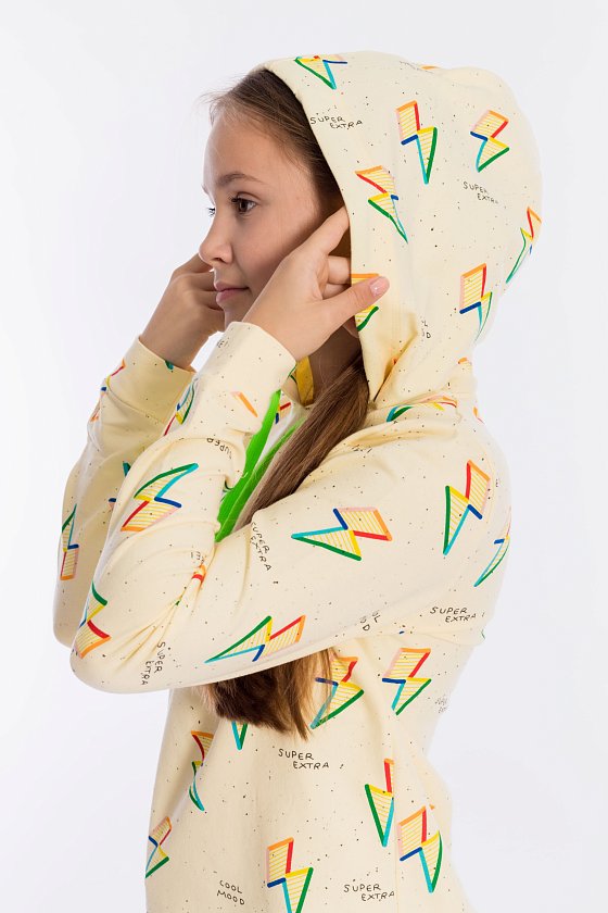 Толстовка для девочек с капюшоном из футера с лайкрой и набивным рисунком представляет собой модную и комфортную одежду для маленьких модниц.