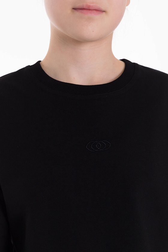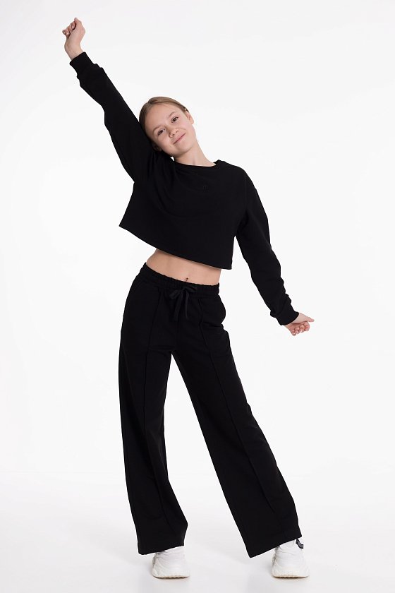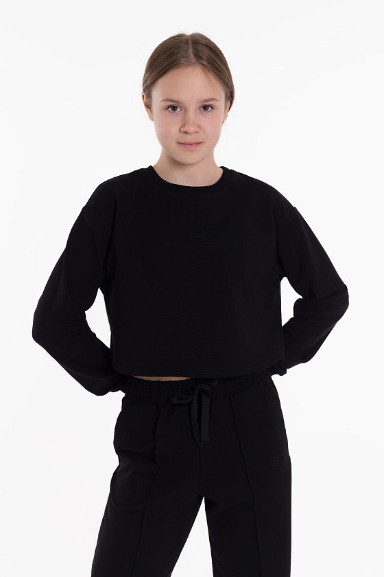 Толстовка для девочки из футера 2х нитки черного цвета - стильное и уютное изделие. Укороченный крой, длинные рукава на манжетах и круглый вырез горловины делают ее современной и комфортной для ношения.