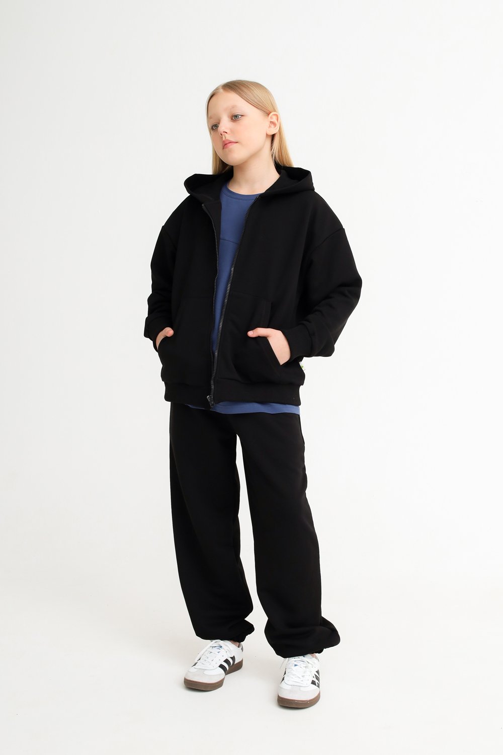 Застежка на металлическую молнию. Накладные карманы-кенгуру. Манжеты на рукавах и по низу изделия - из рибаны