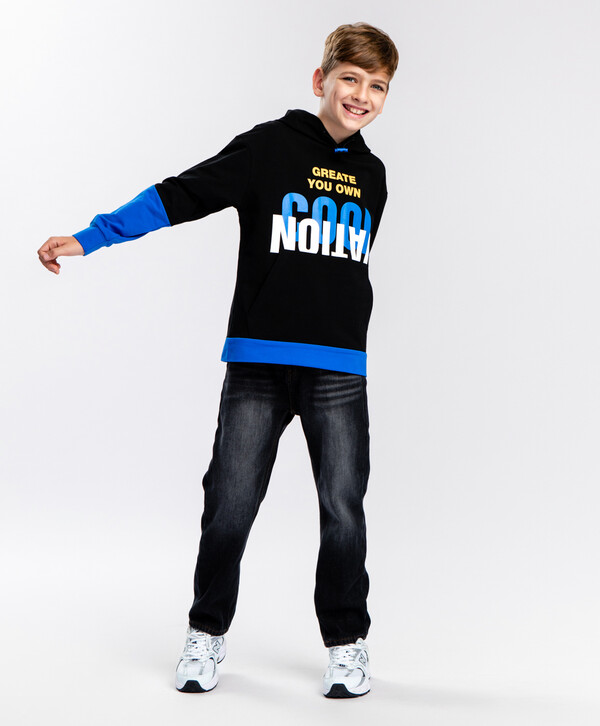 Двухцветная толстовка с капюшоном для мальчика подростка. Капюшон с сетчатой контрастной подкладкой оснащен резинкой с фиксатором для возможности утяжки. На полочке расположен удобный карман-кенгуру. Эластичный низ кофты и манжеты на рукавах выполнены из основной ткани. Трикотажная нераспашная толстовка из футера имеет гладкую лицевую сторону и петельчатую изнанку без начеса. Натуральный хлопковый материал с небольшим добавлением эластана подарит комфорт и оптимальную терморегуляцию во время носки. Модель прямого силуэта со спущенной линией плеча обеспечит свободную посадку. Толстовка с капюшоном в стиле колор блок от Баттон Блю дополнена крупным текстовым принтом на полочке.