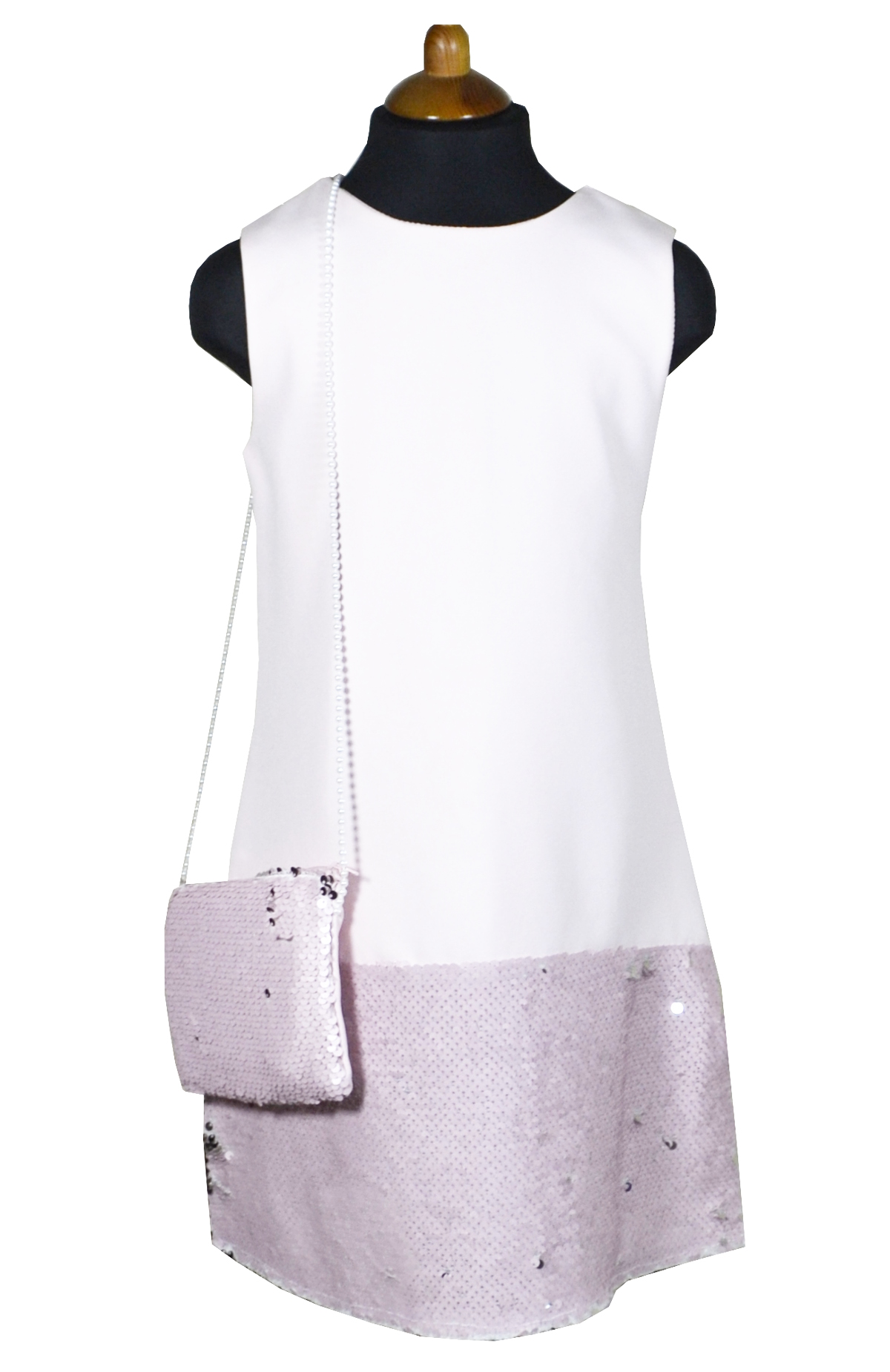 Нарядное платье для девочки на хлопковом подкладе. Ткань не трикотажная , напоминает креп, немного тянется. Застежка по спинке на потайную молнию. Платье украшено вставками из пайеток-перевертышей. Крой приталенный. В комплект входит сумка. Пошив хне идеальный, где-то требуется проутюжить швы.