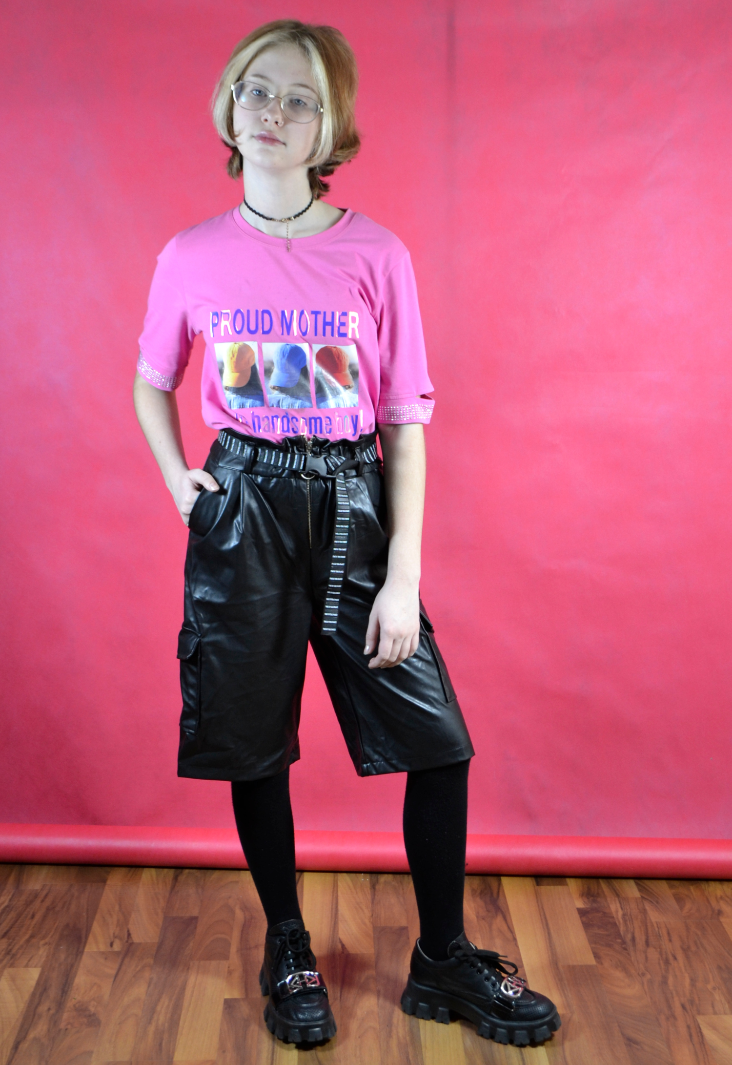 Модные шорты для девочки из кожзама. Пояс на резинке. Застежка на замок. Дополнены стильным поясом. Длина до колена. Функциональные карманы, в т.ч. и накладные. В размер.