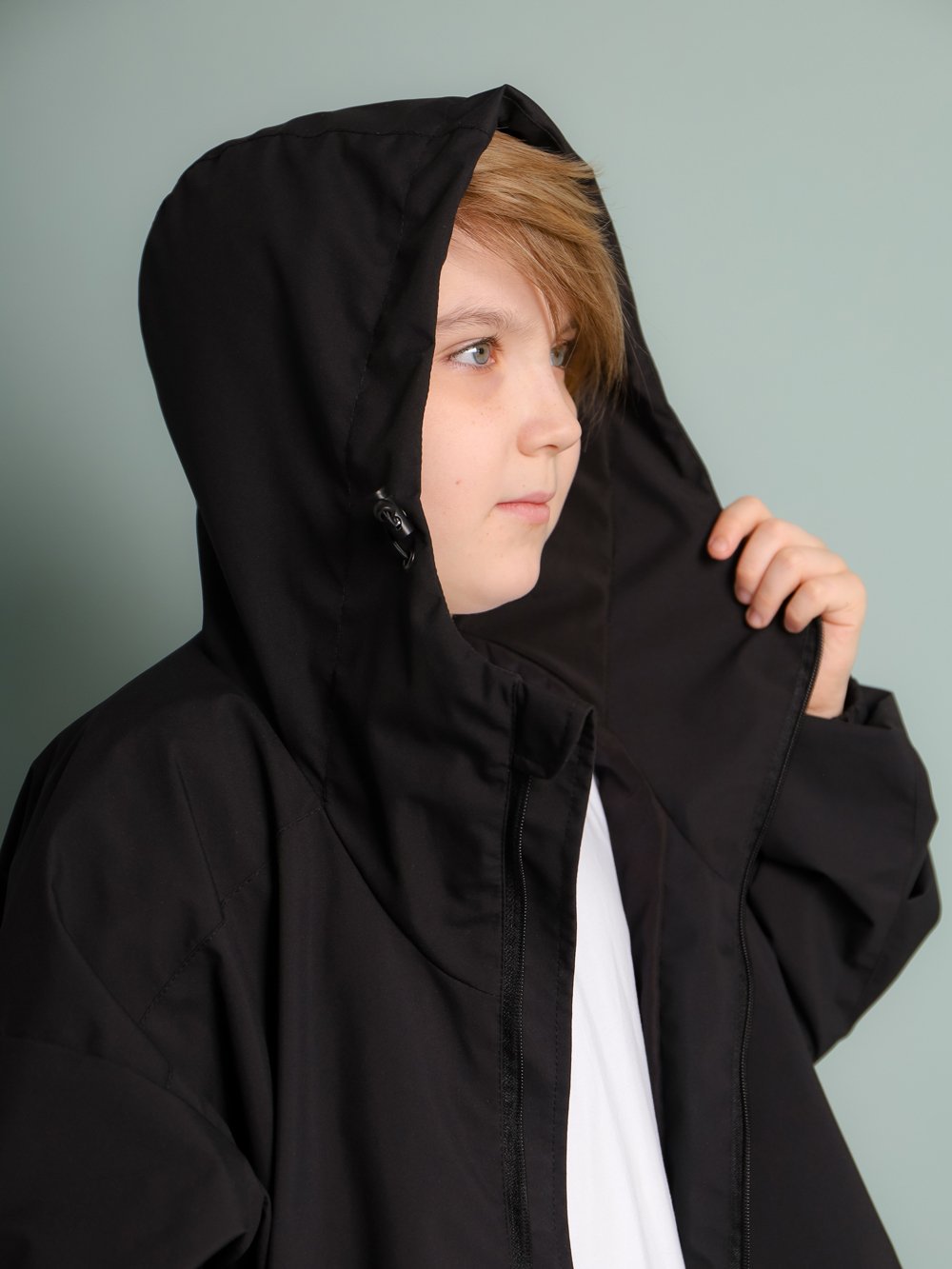 Ветровка объёмная, прямого силуэта на подкладке. Рукав со спущенным плечом, складками по локтевому шву и с манжетой на резинке по низу рукава. На полочках в рельефах карманы с потайной молнией. Центральная застежка на молнию с внутренним ветрозащитным клапаном с защитой от защемления подбородка. Капюшон втачной, с утяжкой на шнуровую резинку по лицевому краю с фиксатором через люверсы. По спинке кокетка с кантом с/в, частично переходящая на полочку. По низу ветровки, с внешней стороны, вставлена шнуровая резинка с фиксатором через люверсы.