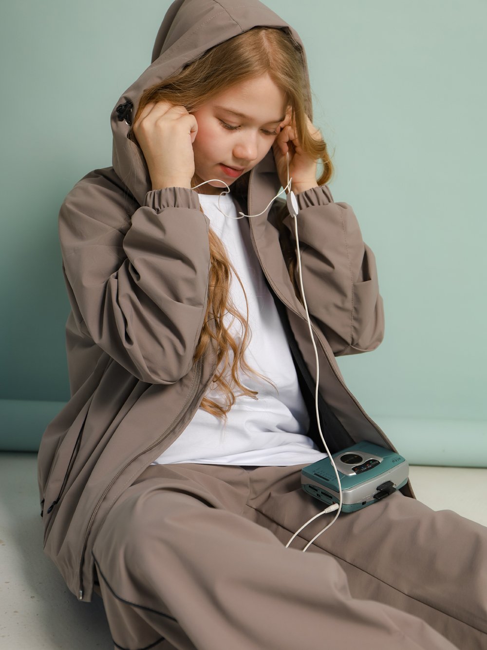 Ветровка объёмная, прямого силуэта на подкладке. Рукав со спущенным плечом, складками по локтевому шву и с манжетой на резинке по низу рукава. На полочках в рельефах карманы с потайной молнией. Центральная застежка на молнию с внутренним ветрозащитным клапаном с защитой от защемления подбородка. Капюшон втачной, с утяжкой на шнуровую резинку по лицевому краю с фиксатором через люверсы. По спинке кокетка с кантом с/в, частично переходящая на полочку. По низу ветровки, с внешней стороны, вставлена шнуровая резинка с фиксатором через люверсы.