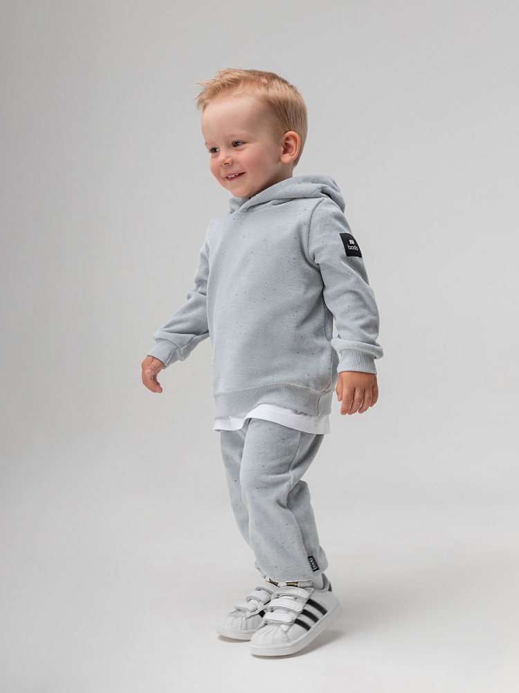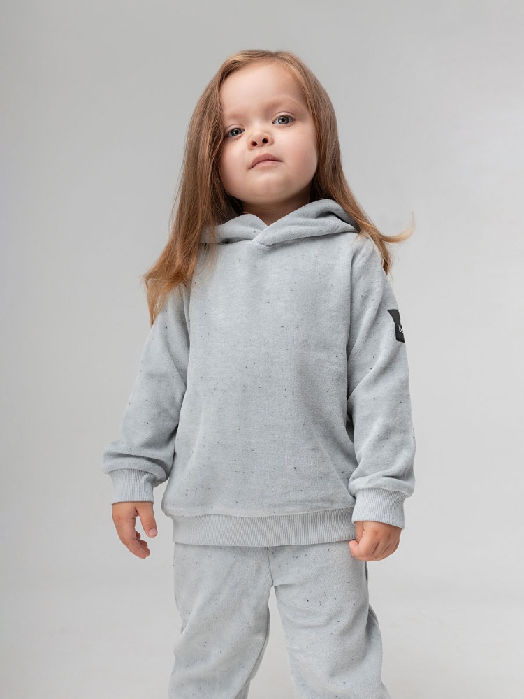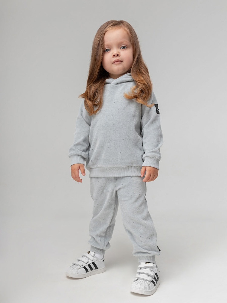 Материал велюр Состав 80% хлопок 20% полиэстер Костюм для детей ясельного возраста. Толстовка без подкладки, прямого силуэта, на притачном поясе по низу изделия, с втачными рукавами с притачной манжетой, капюшон на обтачке. Брюки прямые на притачном поясе с внутренней резинкой. Брюки с манжетой.