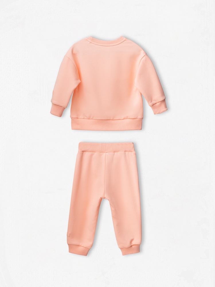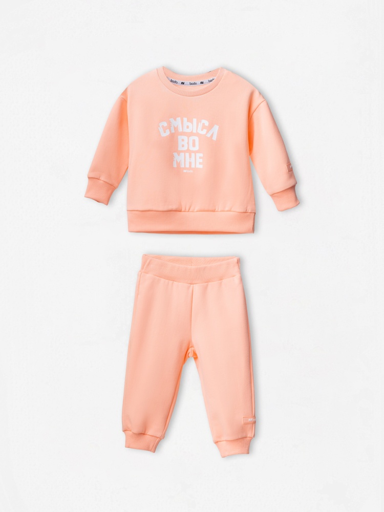 Материал футер двухнитка с начесом Состав 92% хлопок 8% лайкра Костюм для детей ясельного возраста. Толстовка без подкладки, прямого силуэта, с притачным поясом по низу изделия, со спущенным плечом и втачными рукавами с притачной манжетой. Горловина округлой формы. На полочки располагается принт. Брюки прямые на притачном поясе с внутренней резинкой. Брюки с манжетой.