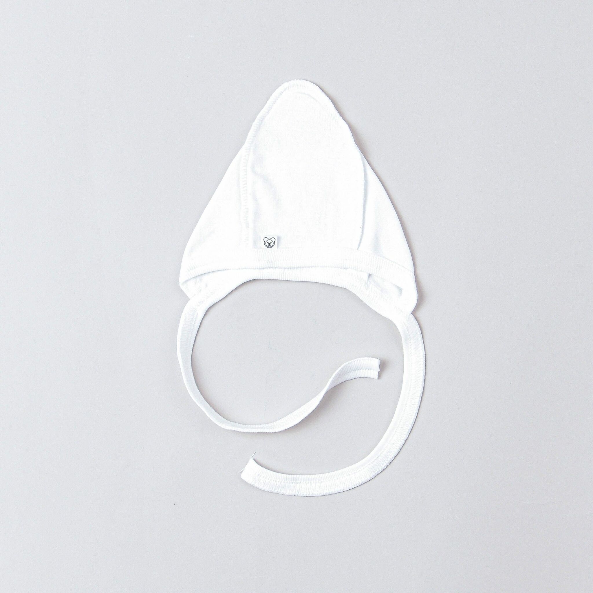 Чепчик заостренной формы из мягкого хлопкового трикотажа. Надежно фиксируется на голове благодаря завязкам. Все швы наружу.