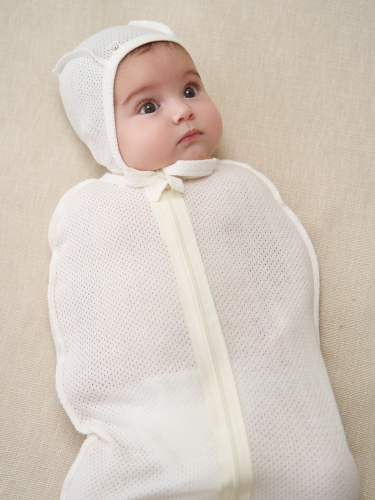 Нежно облегает голову и прикрывает ушки, а мягкие завязки надежно фиксируют его.