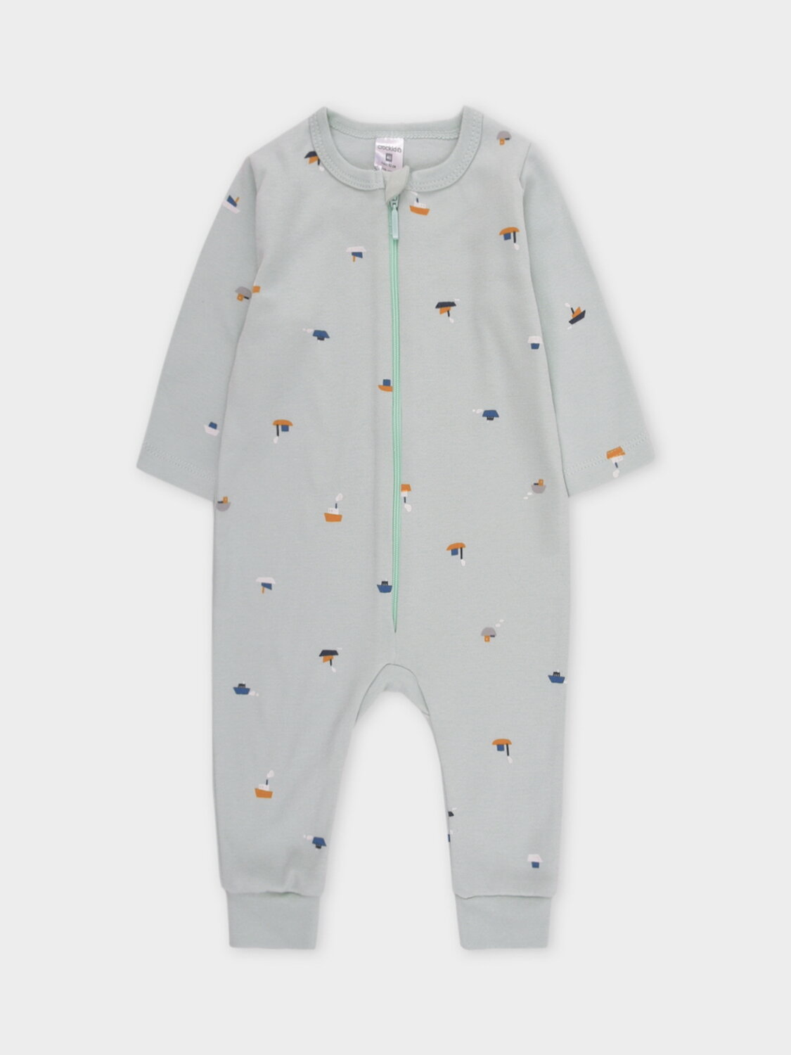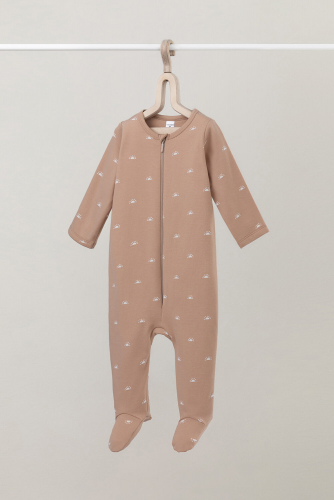 Комбинезон для новорожденных из мягкого, эластичного трикотажа, произведенного из натурального хлопка. Изделие застегивается на молнию. Оригинальная набивка выполнена из стойких, гипоаллергенных текстильных красителей. Все трикотажные полотна производятся в соответсвии с нормами Швейцарского сертификата ЭкоТекс.