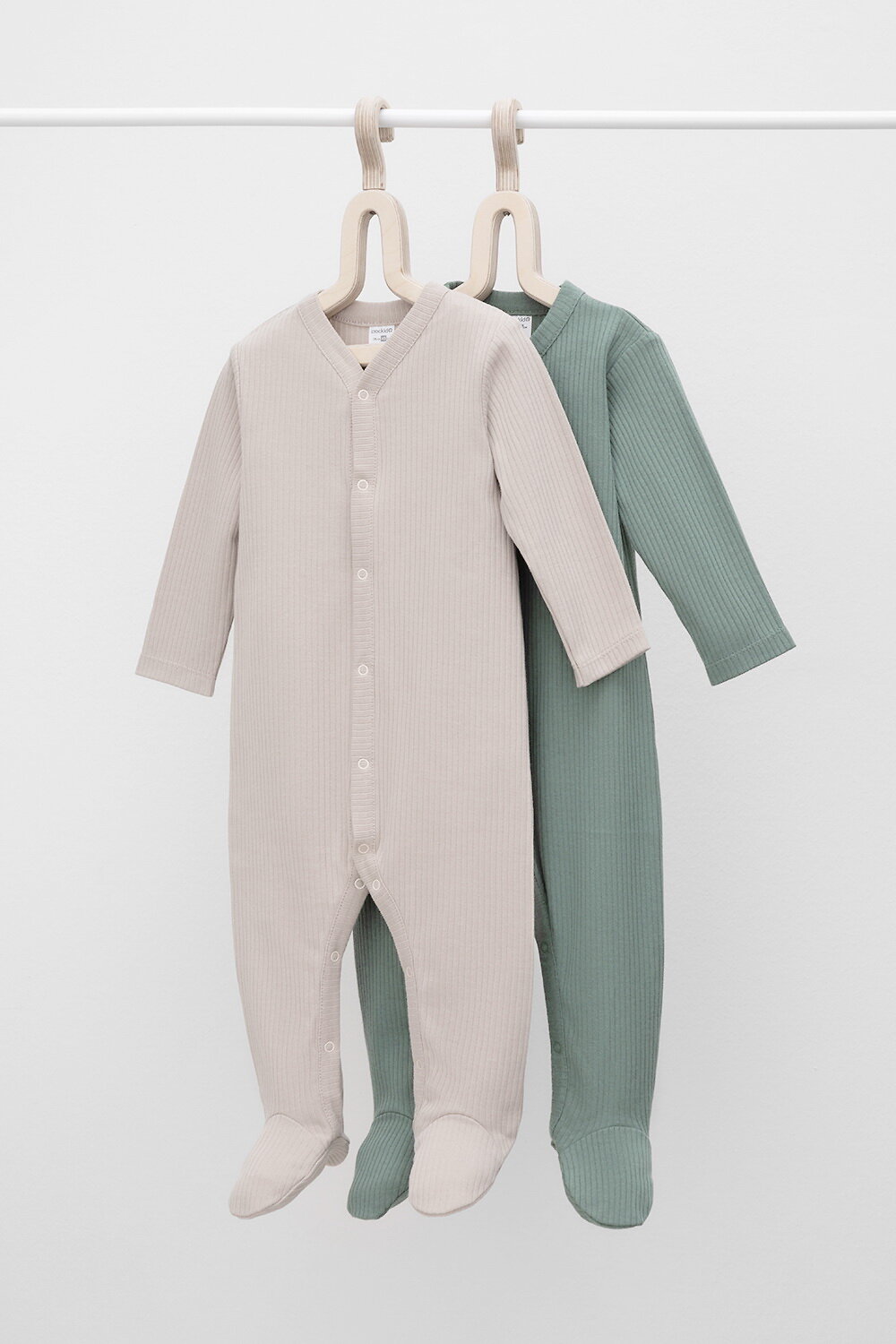 Комбинезоны для новорождённых из мягкого эластичного трикотажа, произведённого из натурального хлопка. В упаковке 2 штуки. Застёгиваются спереди на кнопки. В размере 56 на рукавах предусмотрены антицарапки, швы выполнены наружу. Все трикотажные полотна производятся в соответствии с нормами Швейцарского сертификата ЭкоТекс.