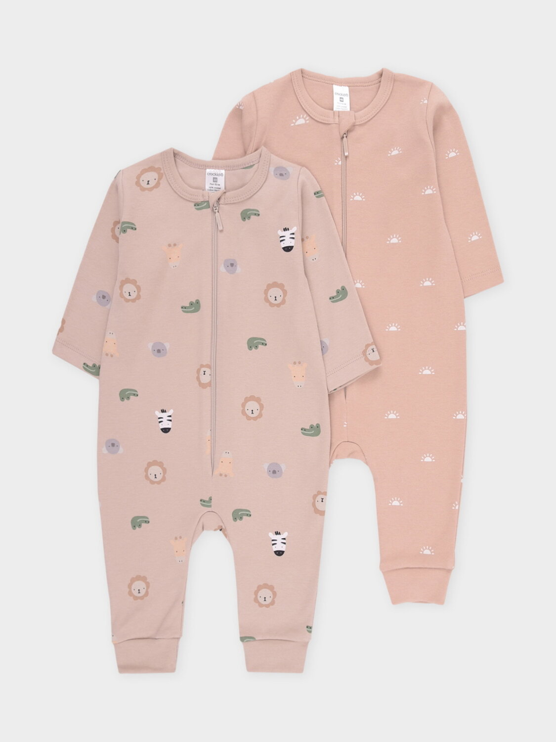 Комбинезоны для новорождённых из мягкого эластичного трикотажа интерлок, произведённого из натурального хлопка. В упаковке 2 штуки. Застёгиваются спереди на молнию, предусмотрена защита подбородка. Оригинальная набивка выполнена из стойких гипоаллергенных текстильных красителей. Все трикотажные полотна производятся в соответствии с нормами Швейцарского сертификата ЭкоТекс.