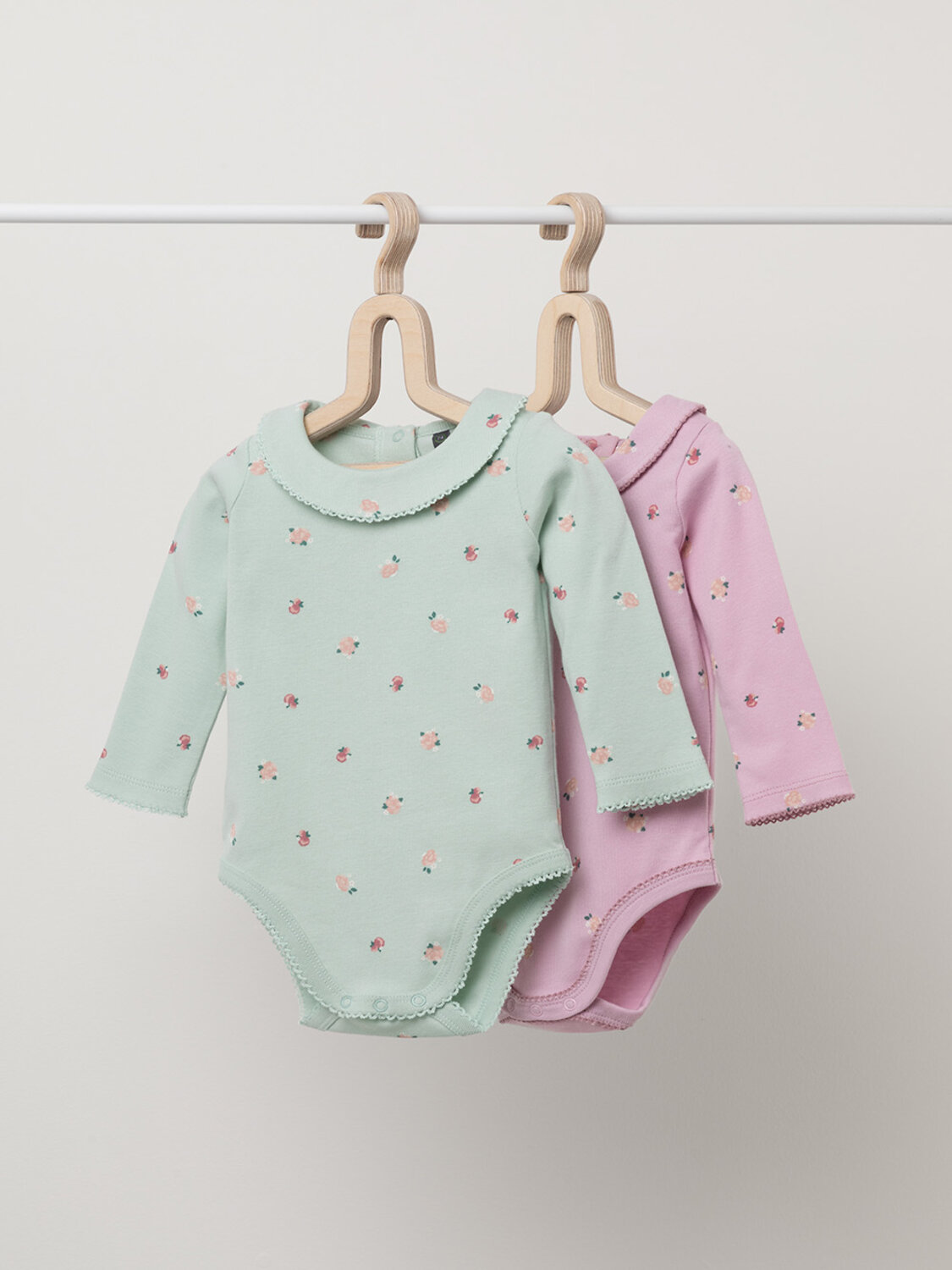 Боди для новорождённых из мягкого эластичного трикотажа, произведённого из натурального хлопка. В упаковке 2 штуки. Застёгиваются на кнопки по низу изделий и на спинке. Оригинальная набивка выполнена из стойких гипоаллергенных текстильных красителей. Все трикотажные полотна производятся в соответствии с нормами Швейцарского сертификата ЭкоТекс.