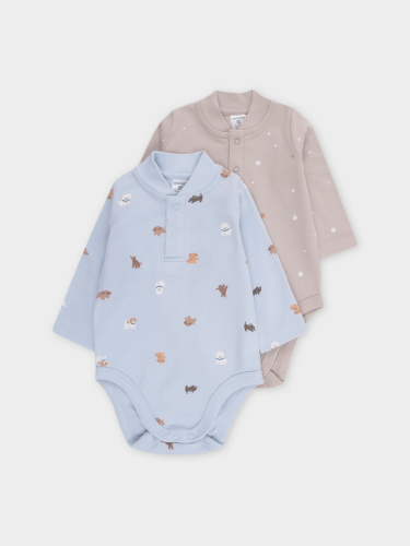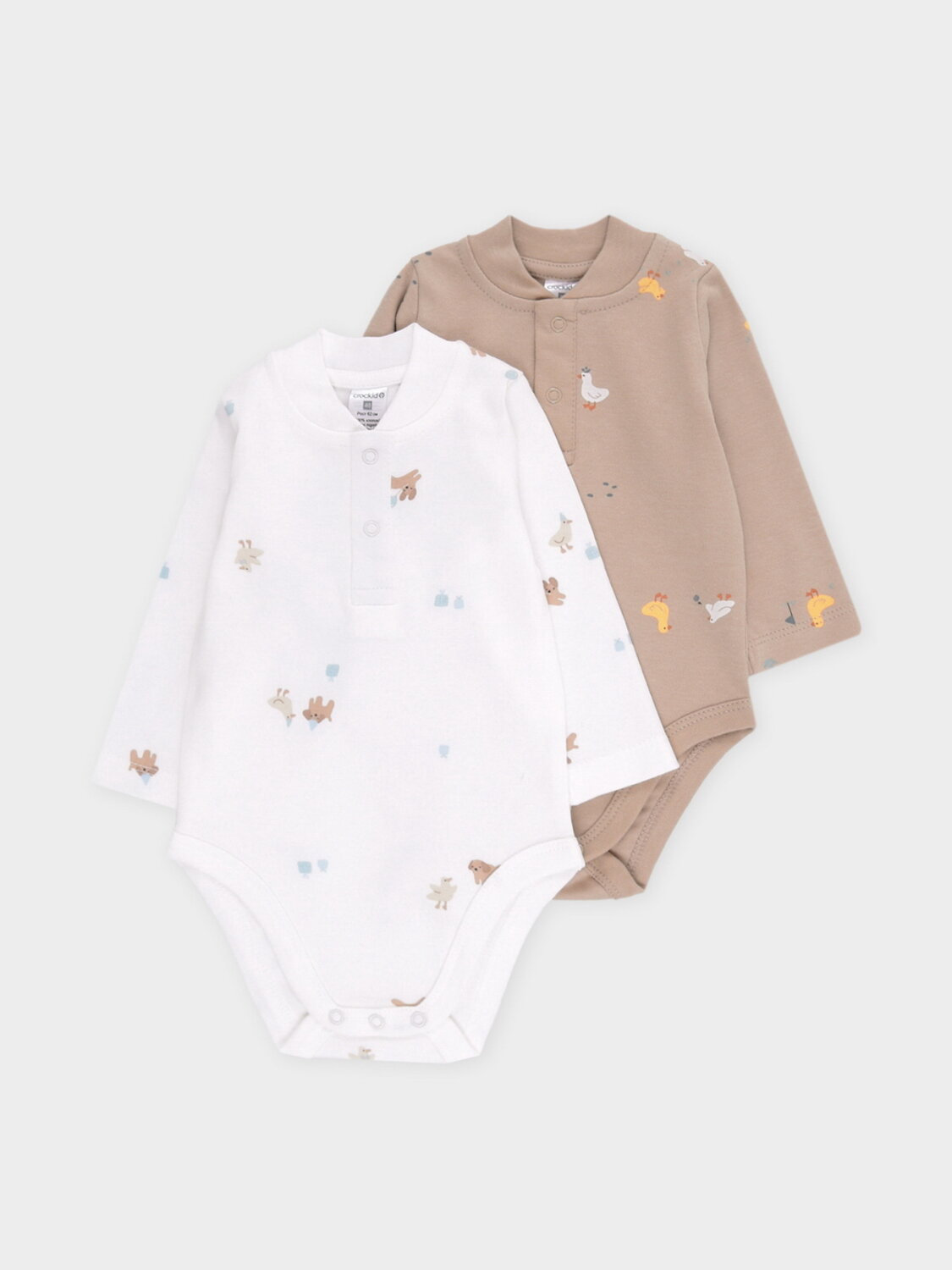 Боди для новорождённых из мягкого эластичного трикотажа, произведённого из натурального хлопка. В упаковке 2 штуки. Застёгиваются на кнопки спереди и по низу изделий. Оригинальная набивка выполнена из стойких гипоаллергенных текстильных красителей. Все трикотажные полотна производятся в соответствии с нормами Швейцарского сертификата ЭкоТекс.