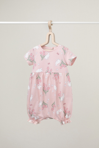 Легкий трикотажный песочник для новорожденной девочки из высококачественного хлопка. Оригинальная набивка выполнена из стойких текстильных гипоаллергенных красителей. Для удобства застежка на кнопки на спине и внизу. Изделие сохраняет цвет и форму после многократных стирок