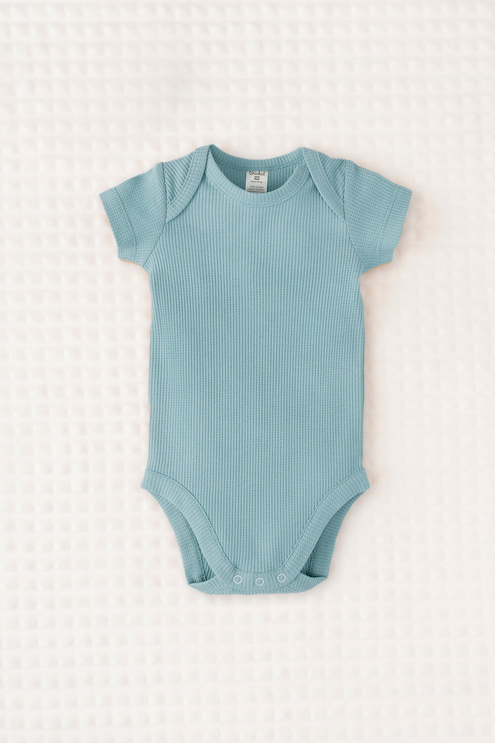Боди с коротким рукавом для новорожденных из мягкого, эластичного вафельного трикотажа произведенного из натурального хлопка. Изделие застегивается на кнопки в области паха. Все трикотажные полотна производятся в соответсвии с нормами Швейцарского сертификата ЭкоТекс.