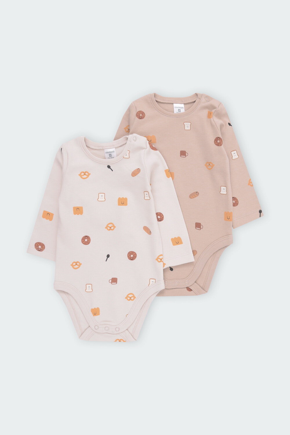 Боди в упаковке 2 шт для новорожденных из мягкого, эластичного трикотажа произведенного из натурального хлопка. Изделие застегивается на кнопки. Оригинальная набивка выполнена из стойких, гипоаллергенных, текстильных красителей. Все трикотажные полотна производятся в соответсвии с нормами Швейцарского сертификата ЭкоТекс.