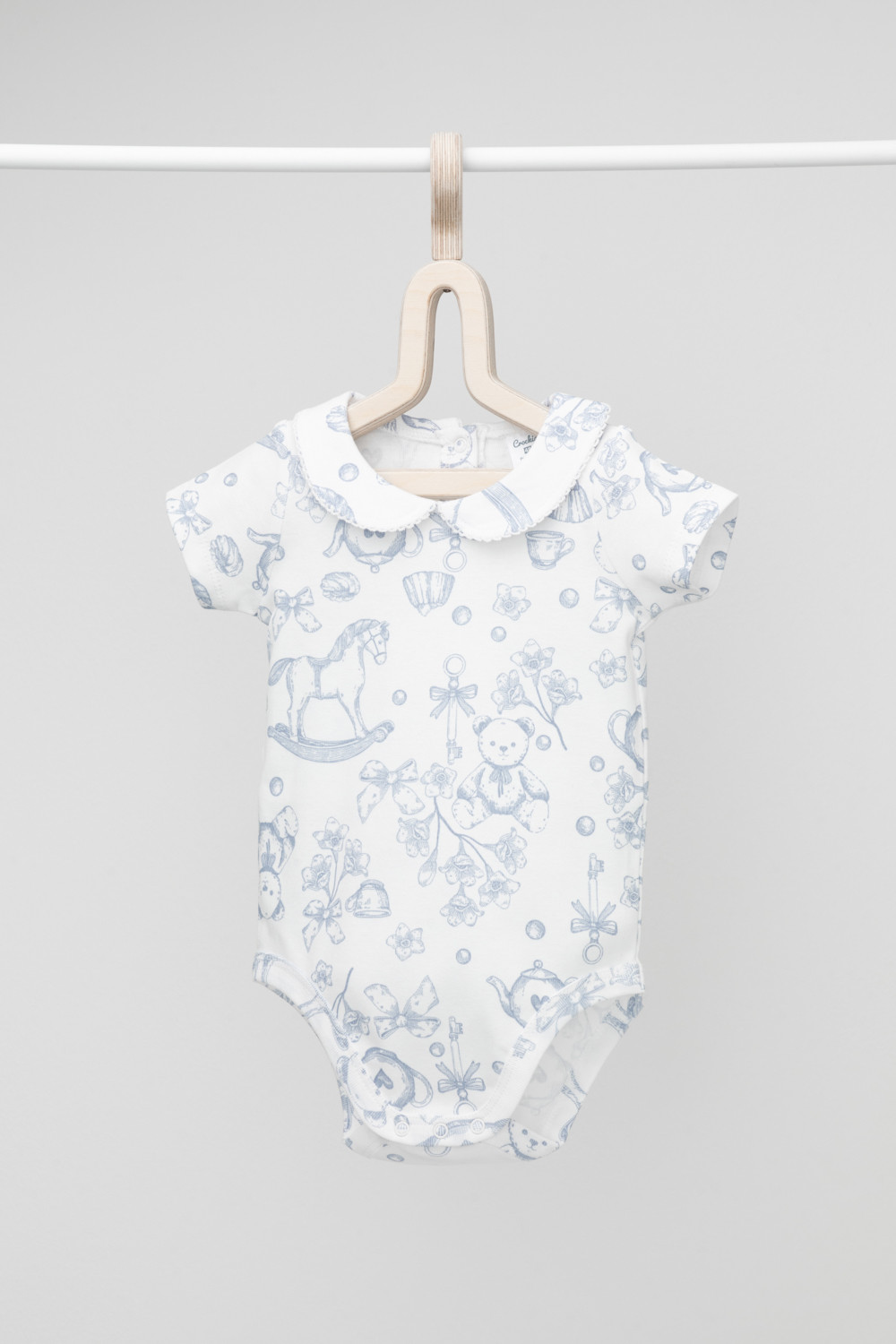 Боди с воротником для новорожденных из мягкого, эластичного трикотажа произведенного из натурального хлопка. По спинке планка с кнопкми. Изделие застегивается на кнопки в области паха. Все трикотажные полотна производятся в соответсвии с нормами Швейцарского сертификата ЭкоТекс.