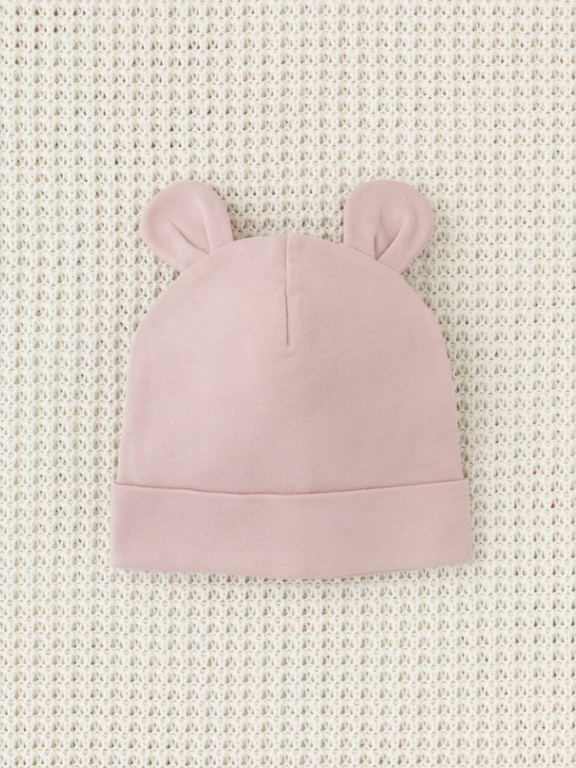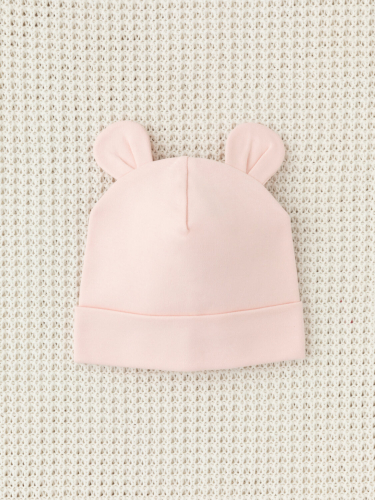 Шапка с отворотом для новорождённых из мягкого эластичного трикотажа интерлок, произведённого из натурального хлопка. Украшена декоративными ушками. Все трикотажные полотна производятся в соответствии с нормами Швейцарского сертификата ЭкоТекс.