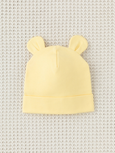 Шапка с отворотом для новорождённых из мягкого эластичного трикотажа интерлок, произведённого из натурального хлопка. Украшена декоративными ушками. Все трикотажные полотна производятся в соответствии с нормами Швейцарского сертификата ЭкоТекс.