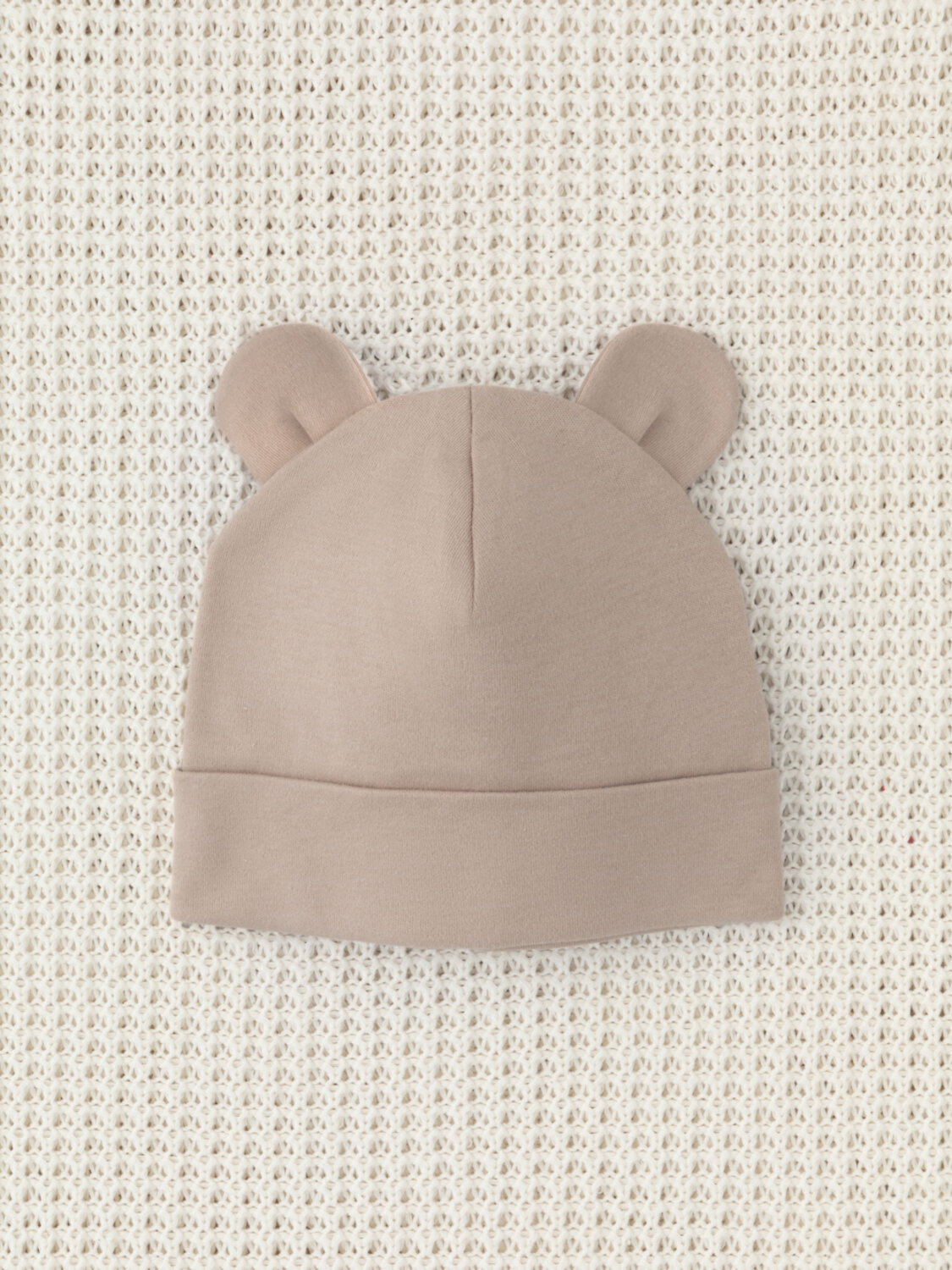 Шапка с отворотом для новорождённых из мягкого эластичного трикотажа интерлок, произведённого из натурального хлопка. Украшена декоративными ушками. Все трикотажные полотна производятся в соответствии с нормами Швейцарского сертификата ЭкоТекс.