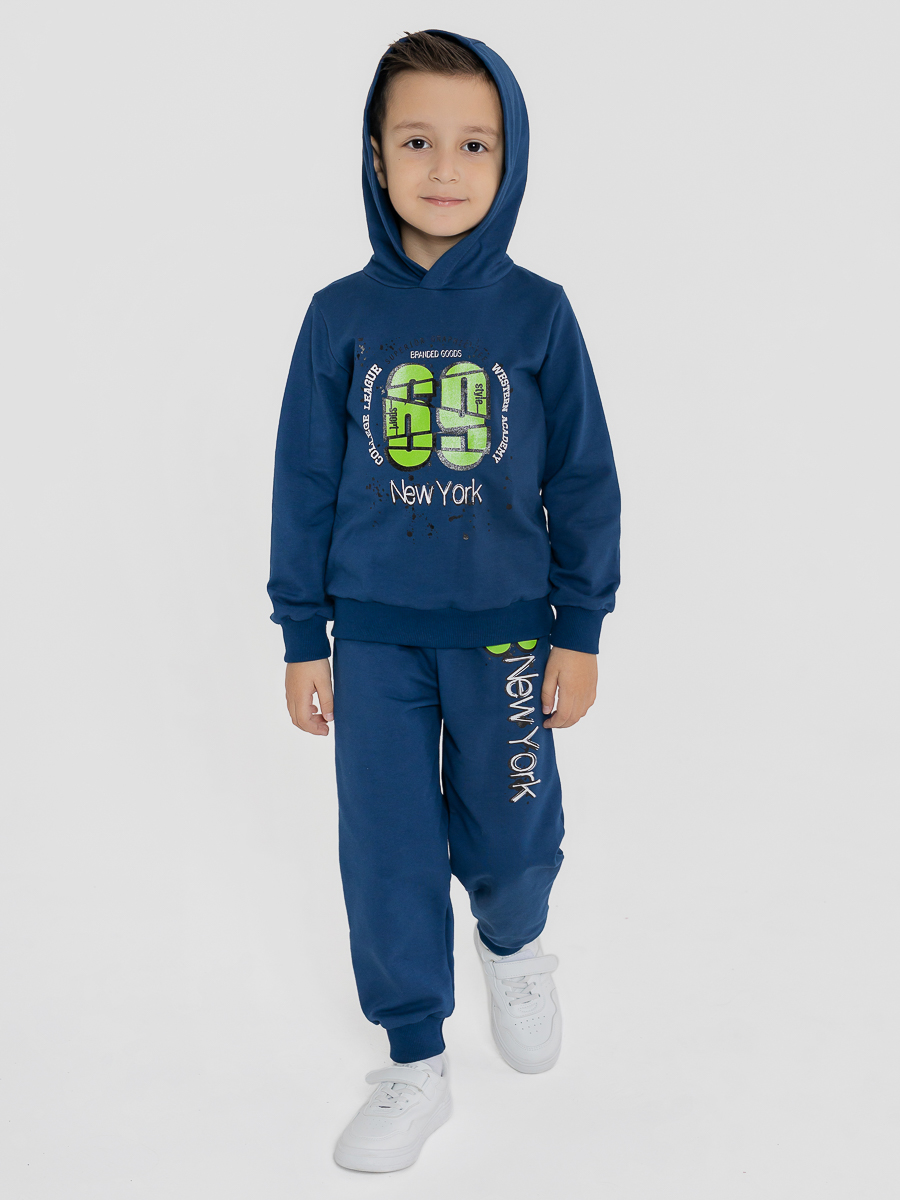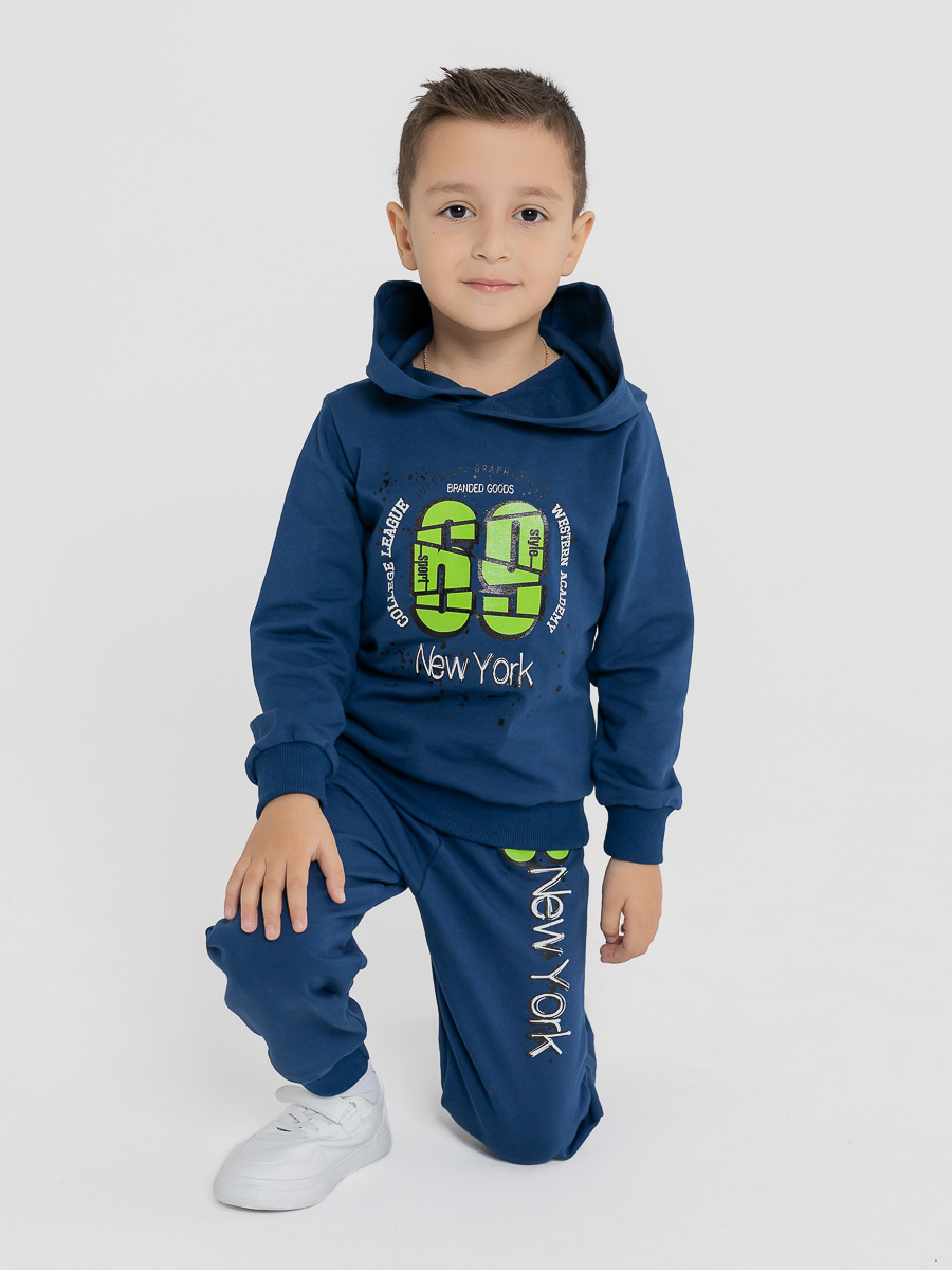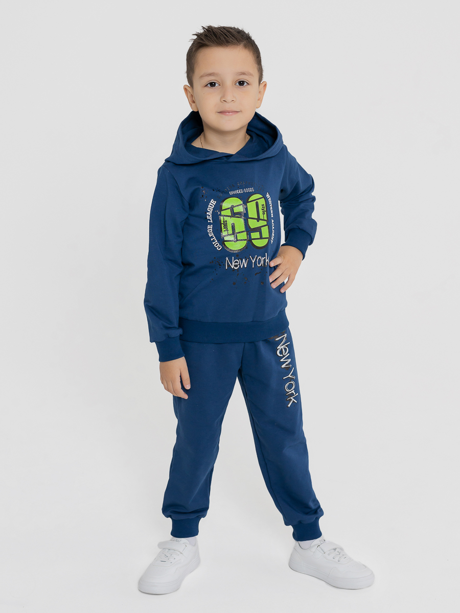 Костюм Аксель для мальчиков, предназначен для носки в прохладных помещениях и прогулки на улице, выполнен из мягкого футера-петля. Толстовка с капюшоном на поясе, рукава на манжетах. Штанишки на манжетах, пояс на резинке. Принт, нанесённый методом шелкографии на ткани. В таком костюме ребёнок будет чувствовать себя комфортно, уютно и всегда будет в центре внимания! Цвет: темно-синий; Материал: футер с лайкрой 2-х нитка;футер с лайкрой 2-х нитка; Состав: 95% хлопок, 5% лайкра.