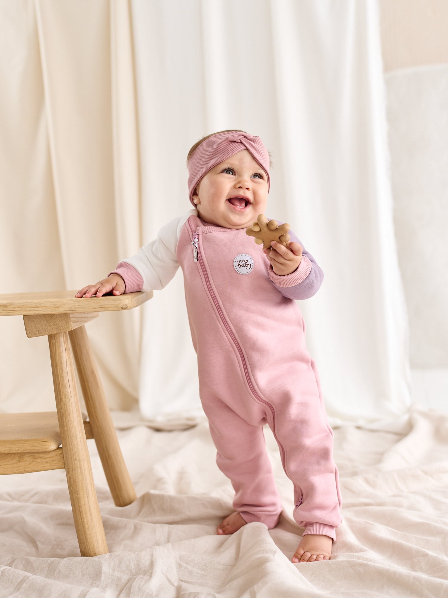 Смещённая молния, уходящая вправое плечо и левую ножку, облегчает переодевание – быстро и удобно сменить одежду после прогулки или перед сном.