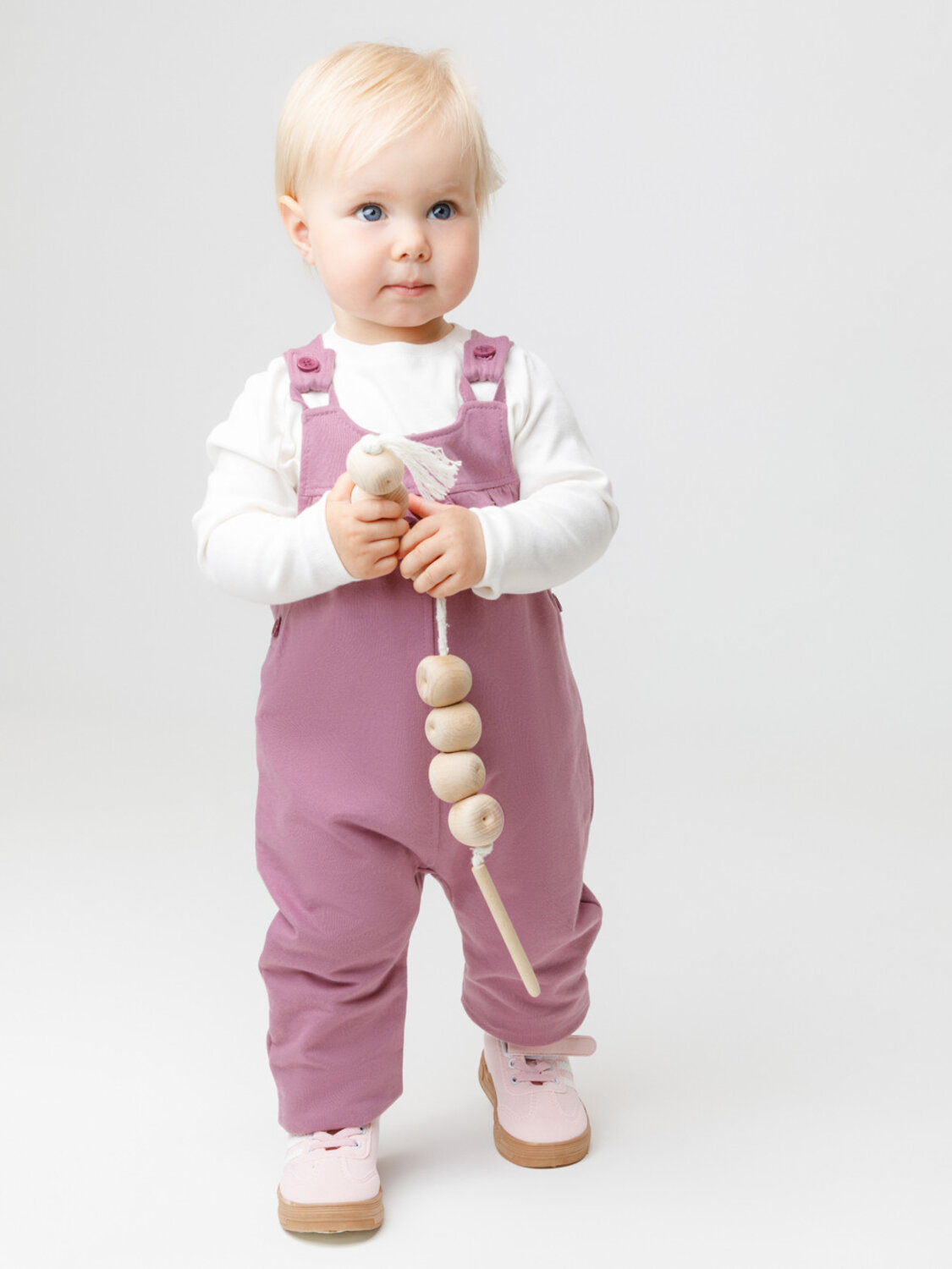 Полукомбинезон с лямками из мягкого петельчатого футера для девочки. Застёгивается на пуговицы. В размерах 74 и 80 предусмотрена пошаговая застёжка на кнопки. Низ на манжетах. Изделие сохраняет цвет и форму после многократных стирок. Все трикотажные полотна производятся в соответствии с нормами швейцарского сертификата ЭкоТекс.
