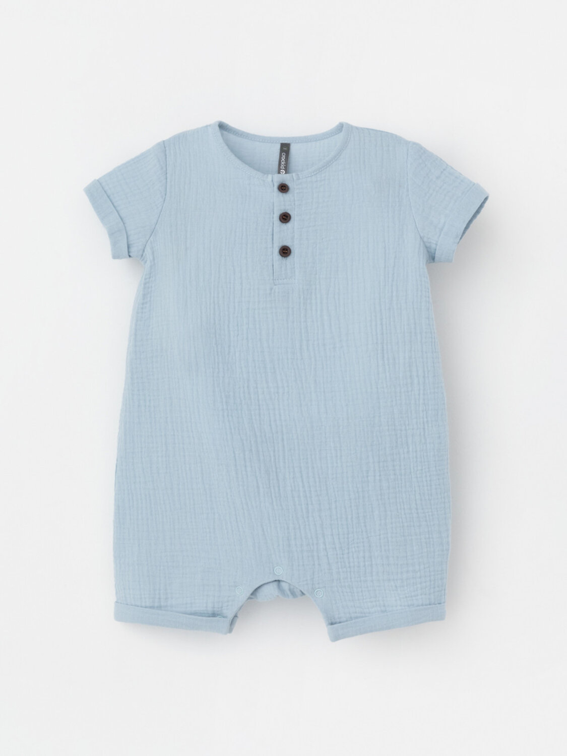 Легкий песочник для мальчика из мягкого хлопокового муслина с застежкой на пуговицы. Изделие сохраняет цвет, форму и фактуру жатости после многократных стирок.