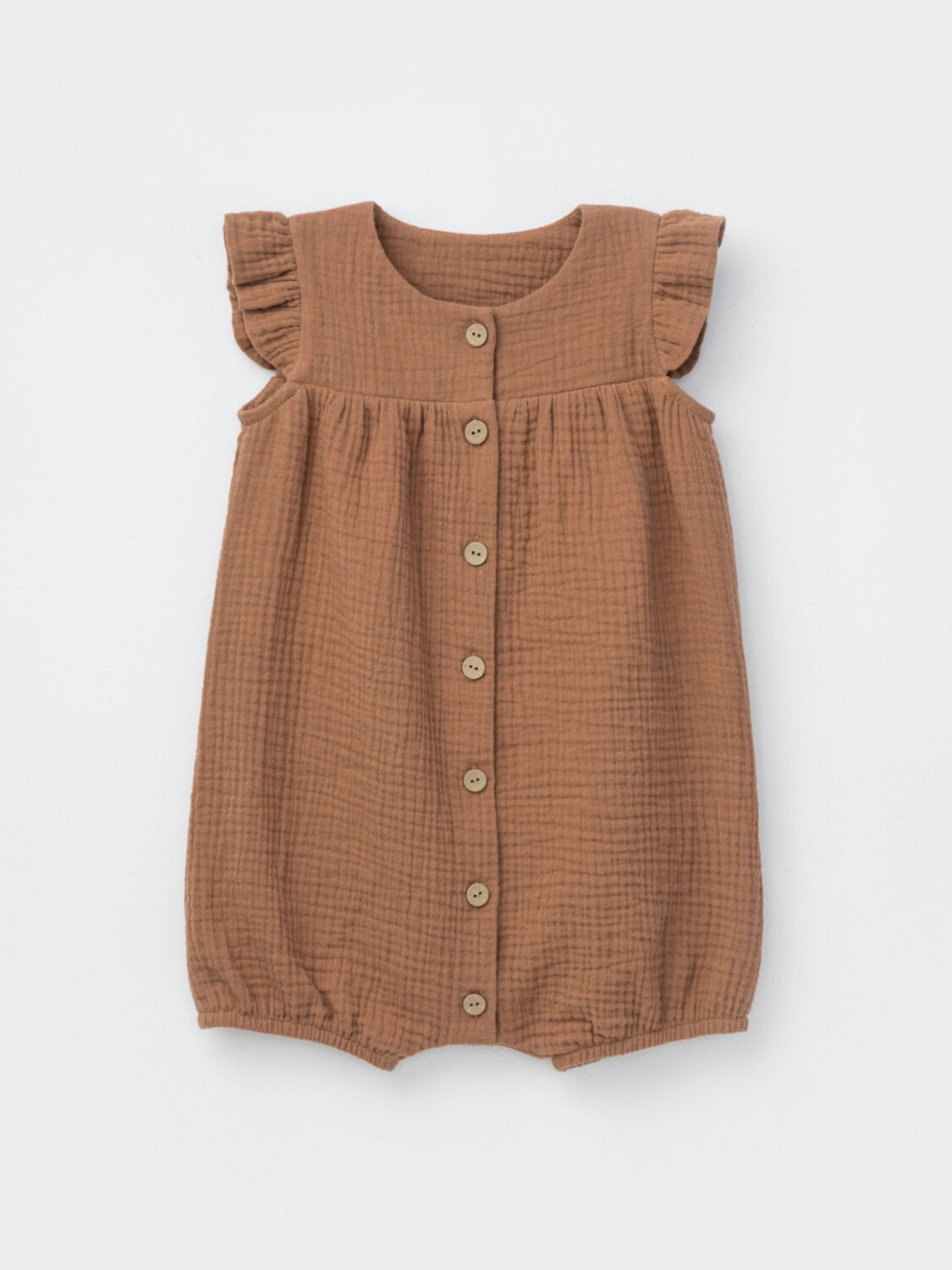 Легкий песочник для девочки из мягкого хлопокового муслина с застежкой на пуговицы. Изделие сохраняет цвет, форму и фактуру жатости после многократных стирок.
