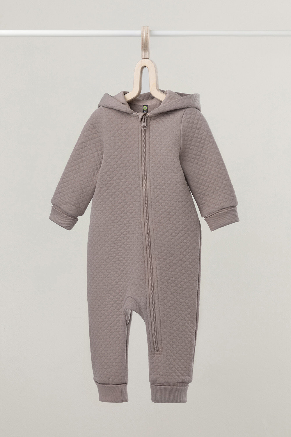 Тёплый комбинезон из капитония для новорождённых. Капитоний – это стёганое трикотажное полотно с утеплителем из полиэстеровой нити. Изделие застёгивается на молнию и имеет капюшон с подкладом из супрема. На рукавах и ножках эластичные манжеты из рибаны. Все трикотажные полотна производятся в соответствии с нормами Швейцарского сертификата ЭкоТекс.