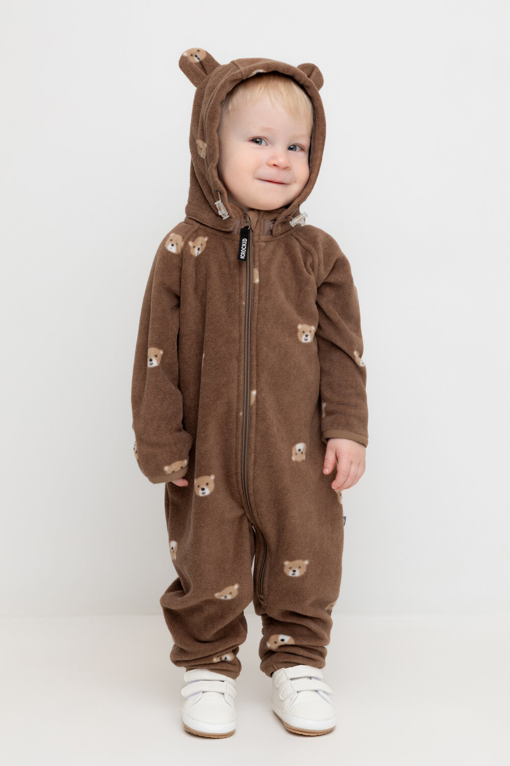 Флисовый комбинезон со съёмным капюшоном для мальчика. У изделия высокий воротник и съёмный капюшон с декоративными ушками на кнопках. Застёгивается на удлинённую молнию. Предусмотрена защита шеи и подбородка. В размерах 40/62 - 48/74 на рукавах и штанинах есть удобные отвороты. Оригинальная набивка выполнена из стойких, гипоаллергенных текстильных красителей. Комбинезон сохраняет цвет и форму после многократных стирок.