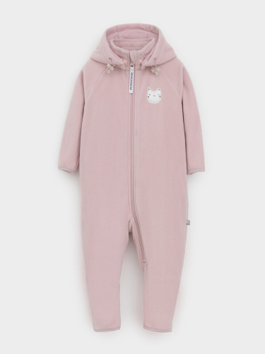 Флисовый комбинезон для девочки со съёмным капюшоном. Капюшон регулируется по ширине с помощью эластичной утяжки со стопперами. Подклад выполнен из гладкого трикотажа супрем, произведённого из высококачественного натурального хлопка. Застёгивается на удлинённую молнию с мягкой защитой шеи и подбородка. В размерах 62, 68 и 74 на рукавах и ножках есть отвороты. Украшен вышивкой. Комбинезон сохраняет цвет и форму после многократных стирок.