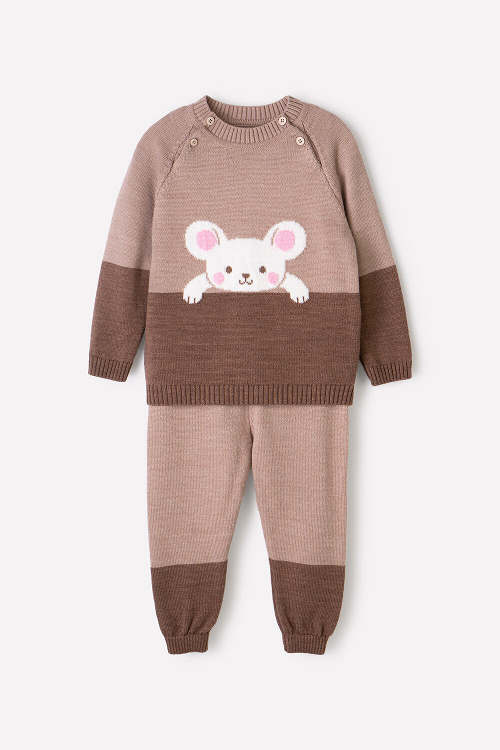 Тёплый вязаный комплект из полушерсти для девочки - джемпер и брюки. Украшен на полочке вывязанным рисунком с изображением милой мордочки. Удобные рукава-реглан. Для удобства одевания застёгивается спереди на пуговицы с двух сторон. Брюки с поясом на резинке.