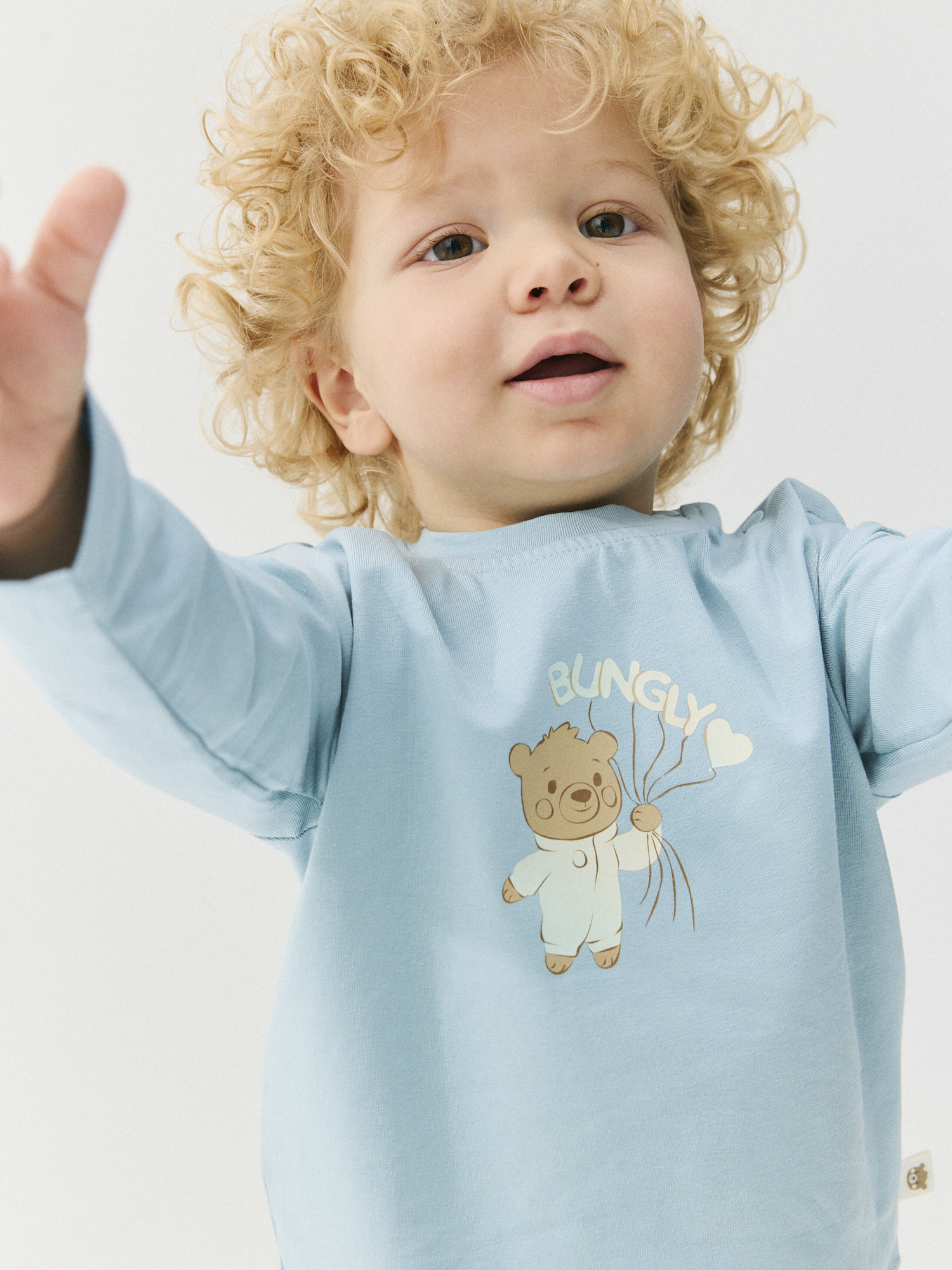 Комфортный лонгслив с ярким и стойким принтом-мишкой понравится малышам.