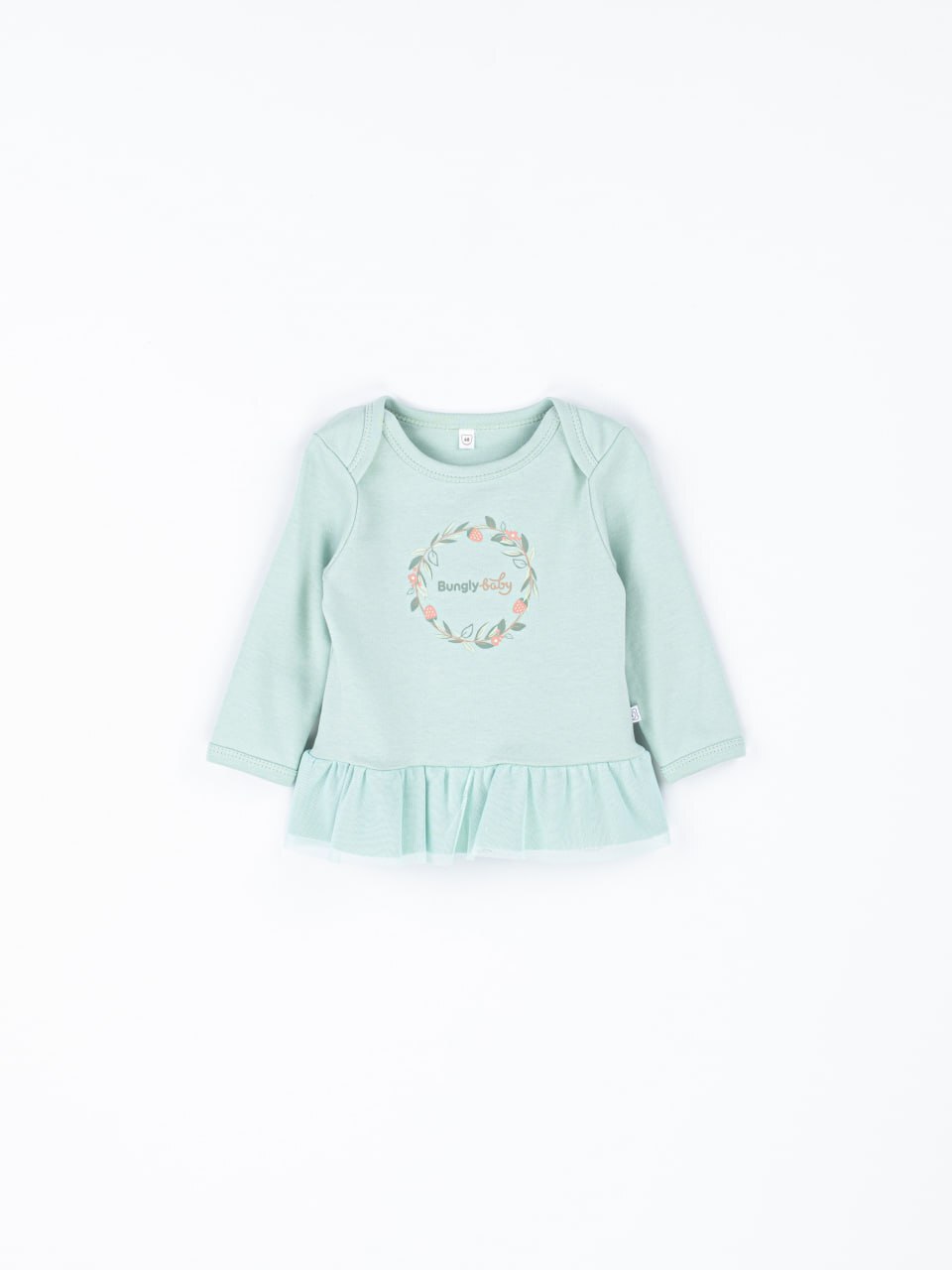 Свободный силуэт с оборкой по нижнему краю изделия.