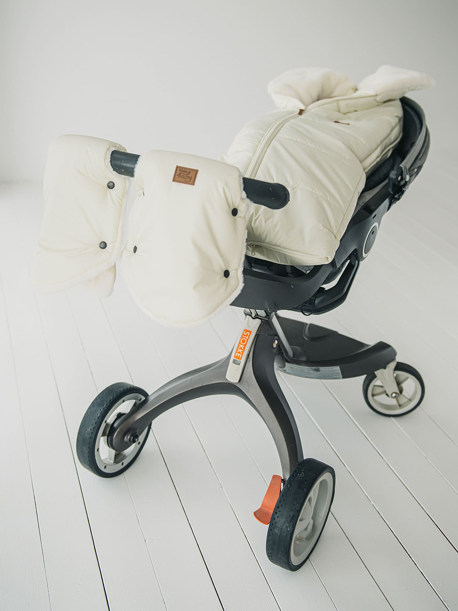 Легко крепится к ручке коляски с помощью кнопок, расположенных по бокам изделия, надежно защищает руки мамы от холода и ветра.