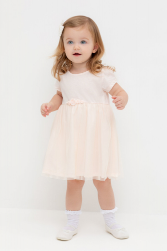 Нарядное платье-боди для девочки из высококачественного трикотажа супрем с лёгким слоем из сетки по юбке. Пояс украшен нежными атласными розочками. Для удобства одевания платье застёгивается на кнопки на спинке и по ножкам. Платье сохраняет форму и стойкий цвет после многочисленных стирок.