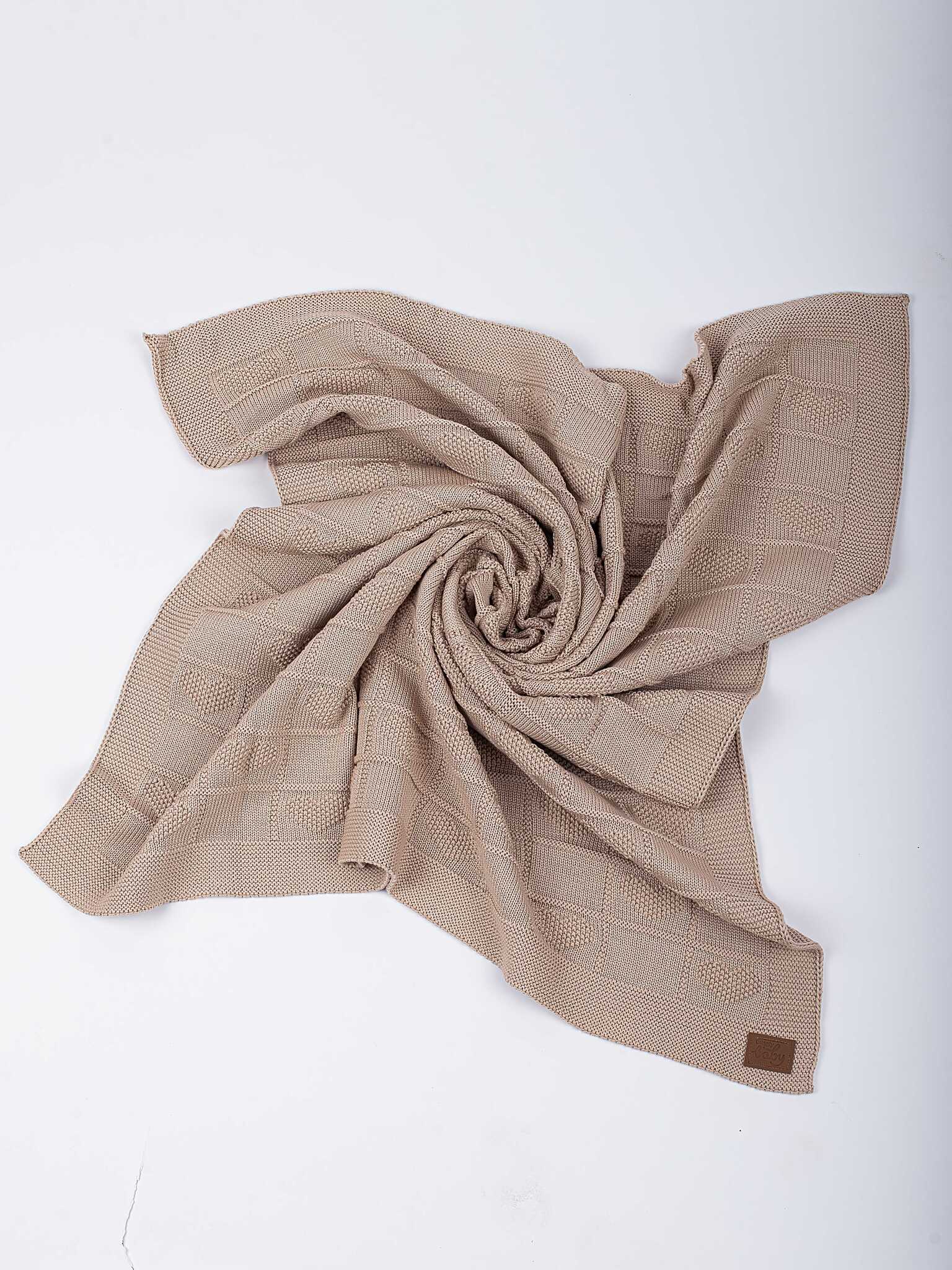 Вязаный плед из мягкого хлопка и акрила с ажурным узором в виде сердечек.