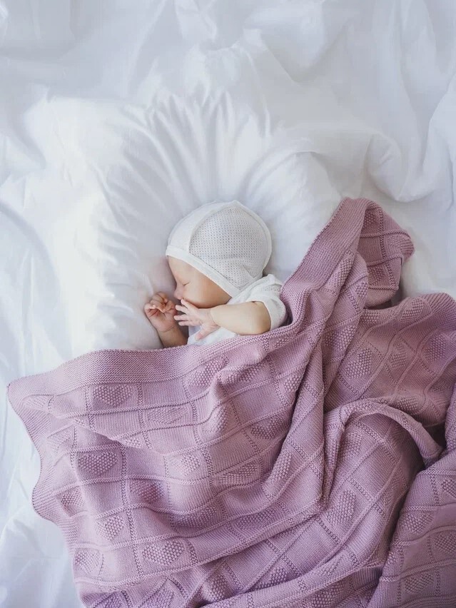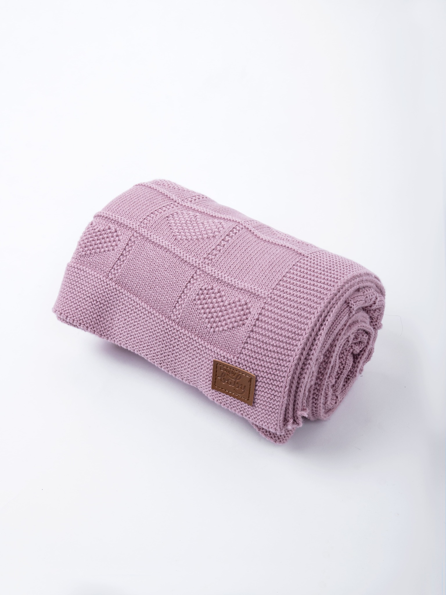 Вязаный плед из мягкого хлопка и акрила с ажурным узором в виде сердечек.