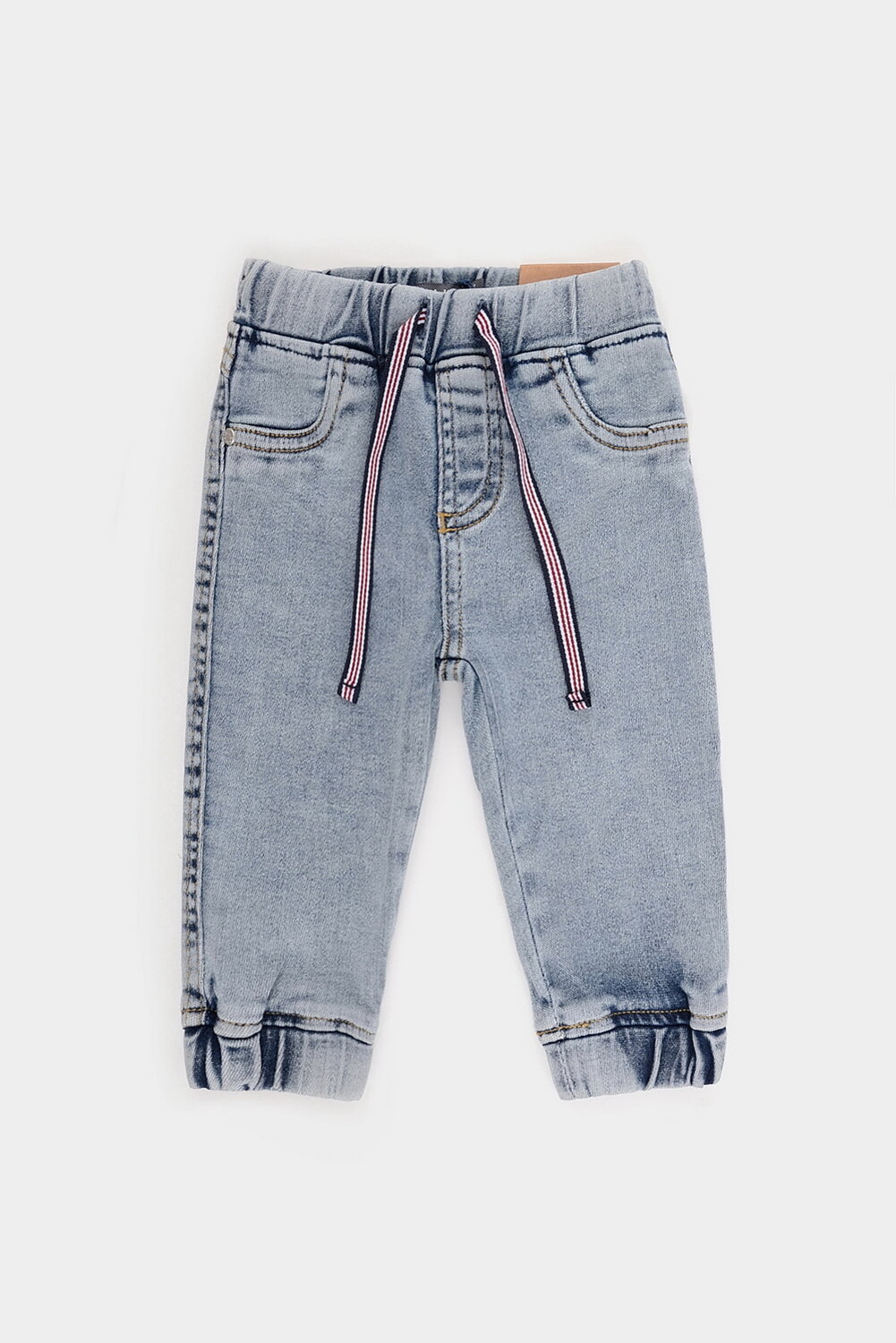Джинсы с поясом на резинке и манжетами с потертостями. Спереди имитация карманов и гульфика.