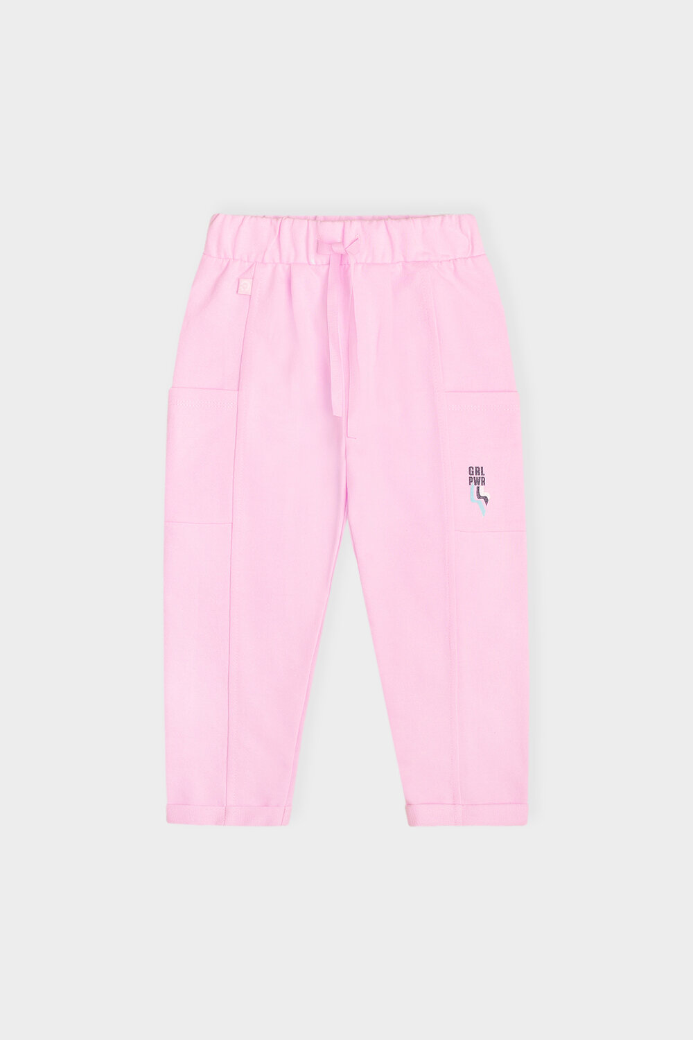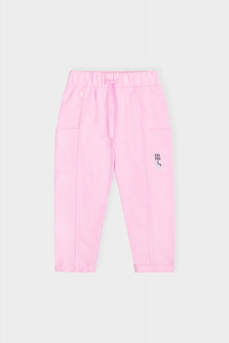Брюки для девочки из футера. В поясе эластичная резинка и лента. Боковые накладные карманы, на левом кармане принт. Отвороты по низу штанин.