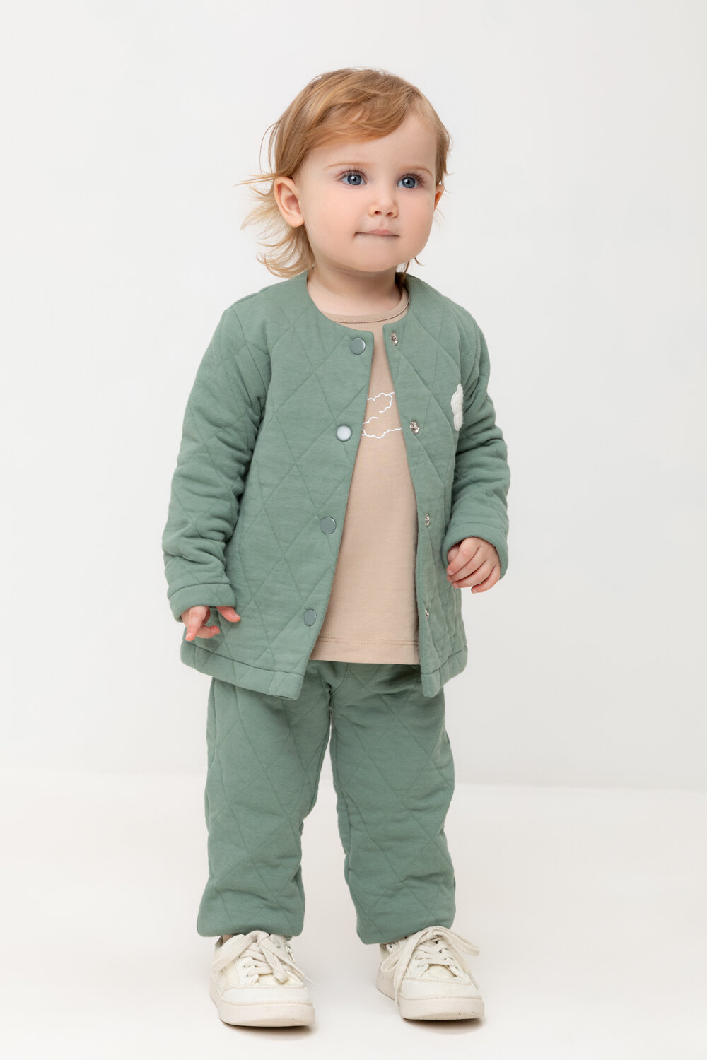 Трикотажные брюки для девочки из стеганого трикотажного полотна. Эластичный пояс на резинке регулируется по ширине с помощью шнурка, внизу манжеты на резинке.