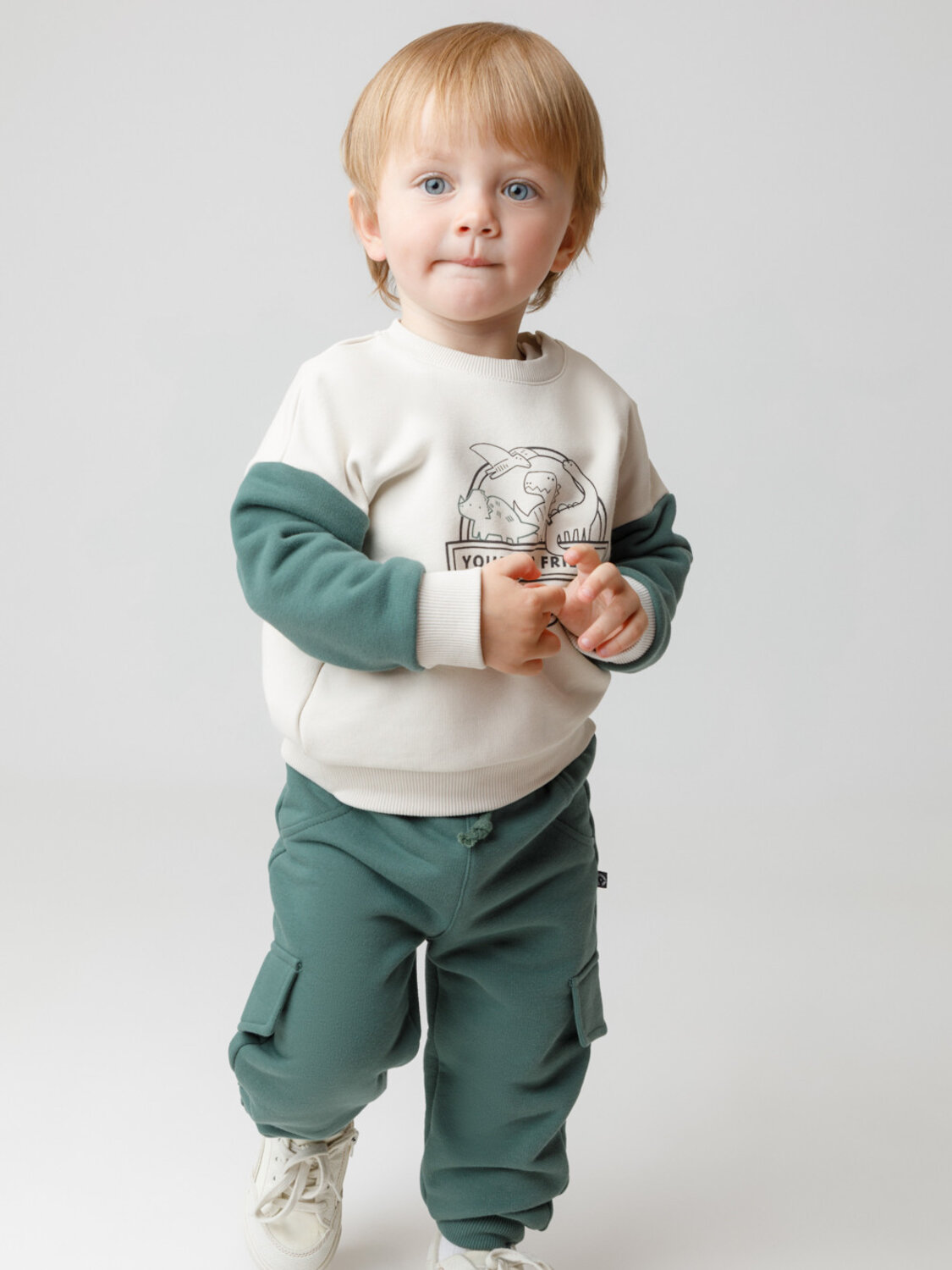 Брюки для мальчика из мягкого петельчатого футера трёхнитки. В составе 80% натурального хлопка и 20% полиэстера, при этом полиэстер ввязан внутрь по особой технологии и не соприкасается с кожей. Модель с эластичным поясом на резинке и утягивающим шнурком для регулировки по талии. По бокам два накладных клапана без карманов. Низ на манжетах. Изделие сохраняет цвет и форму после многократных стирок. Все трикотажные полотна производятся в соответствии с нормами швейцарского сертификата ЭкоТекс.