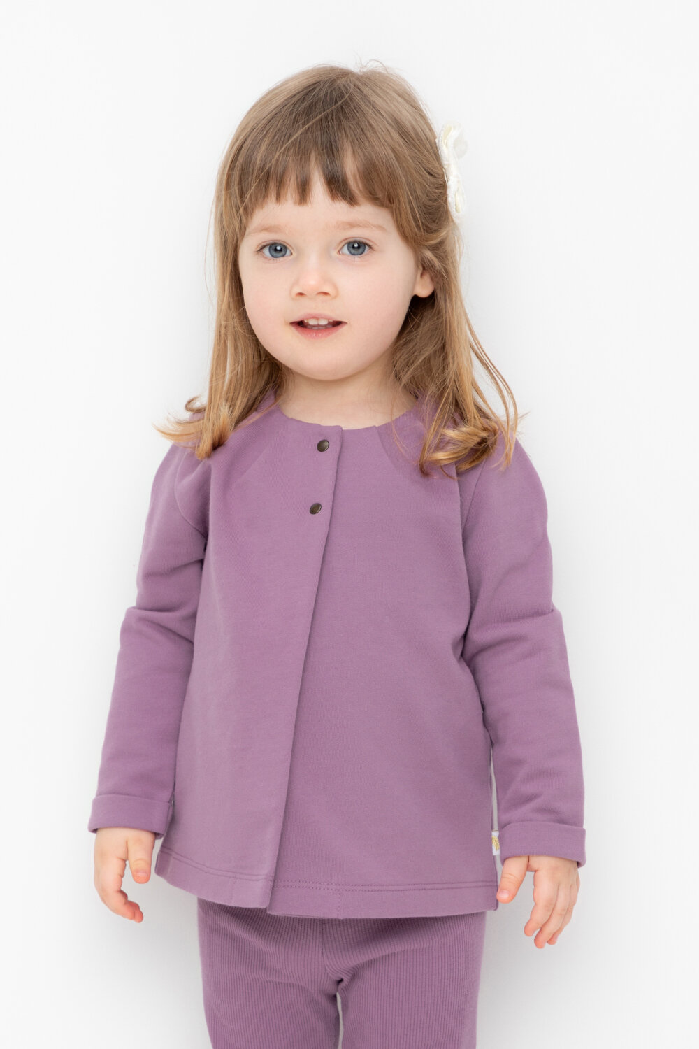 Трикотажная кофточка для девочки из петельчатого футера. По горловине красивые складки. Застегивается сверху на кнопки.